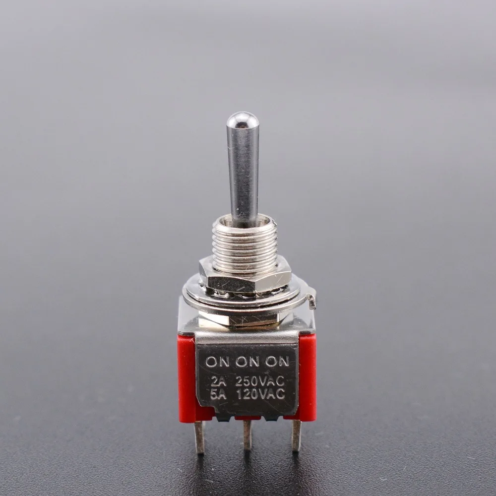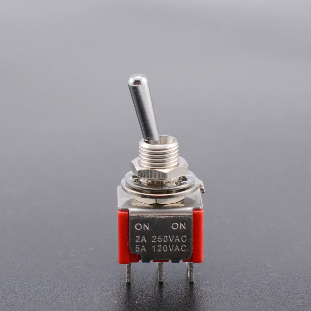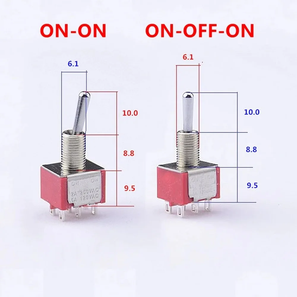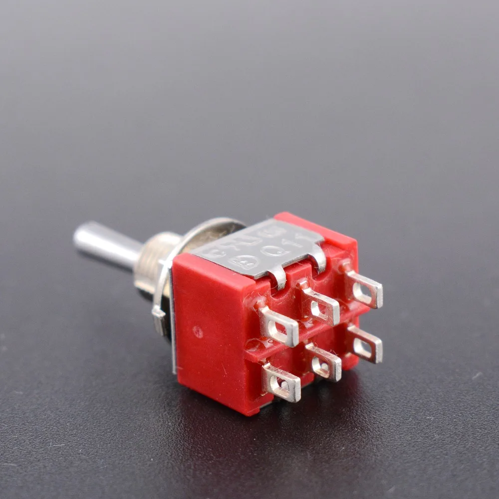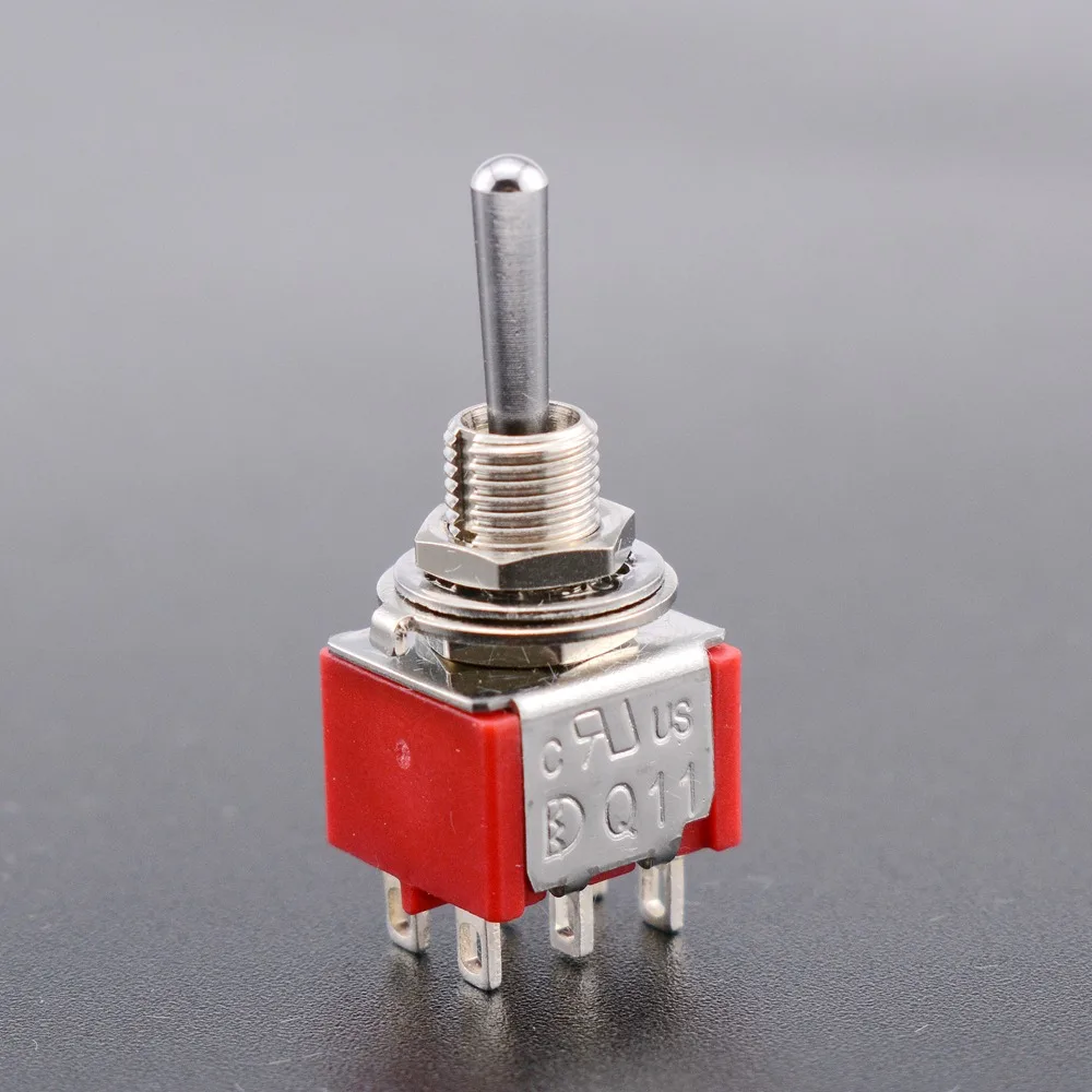 Enhance your electronic projects with this durable mini DPDT toggle switch, available in ON-ON, ON-OFF-ON, and ON-ON-ON configurations. Weighing only 6 grams per piece, the switch features a sleek metal lever handle and a compact design ideal for electric guitar or bass applications. The metal components, including the threaded bushing, offer reliable conductivity and longevity, with a vibrant red plastic housing indicating the switch type. Manufactured in Taiwan, this versatile switch is perfect for those seeking a high-quality, functional component to precisely control electrical circuits, providing both flexibility and durability in a minimalist, industrial aesthetic.