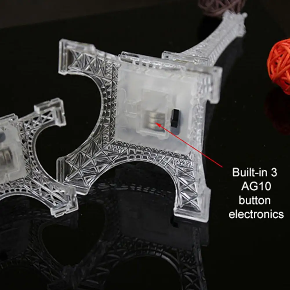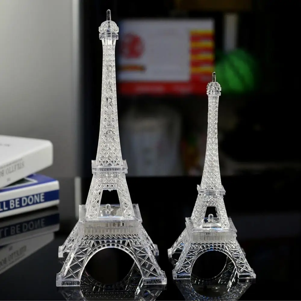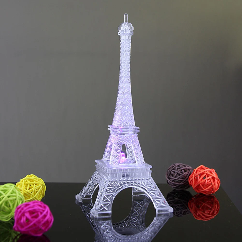 Experience the enchanting charm of this miniature Eiffel Tower-shaped night light, designed to add a touch of Parisian elegance to your home or party setting. Crafted from transparent plastic, this decorative piece features intricate lattice patterns and detailed structural elements that perfectly replicate the iconic Eiffel Tower's architecture. The embedded color-changing LED illuminates the entire tower with vibrant bluish-purple hues, creating a mesmerizing glow that enhances your space with modern sophistication. Whether placed on a bedside table, mounted as a hanging decor, or used as a party centerpiece, this light invites warmth, style, and a sense of wonder. Its charming design and vivid illumination make it a must-have for lovers of design and ambiance alike.