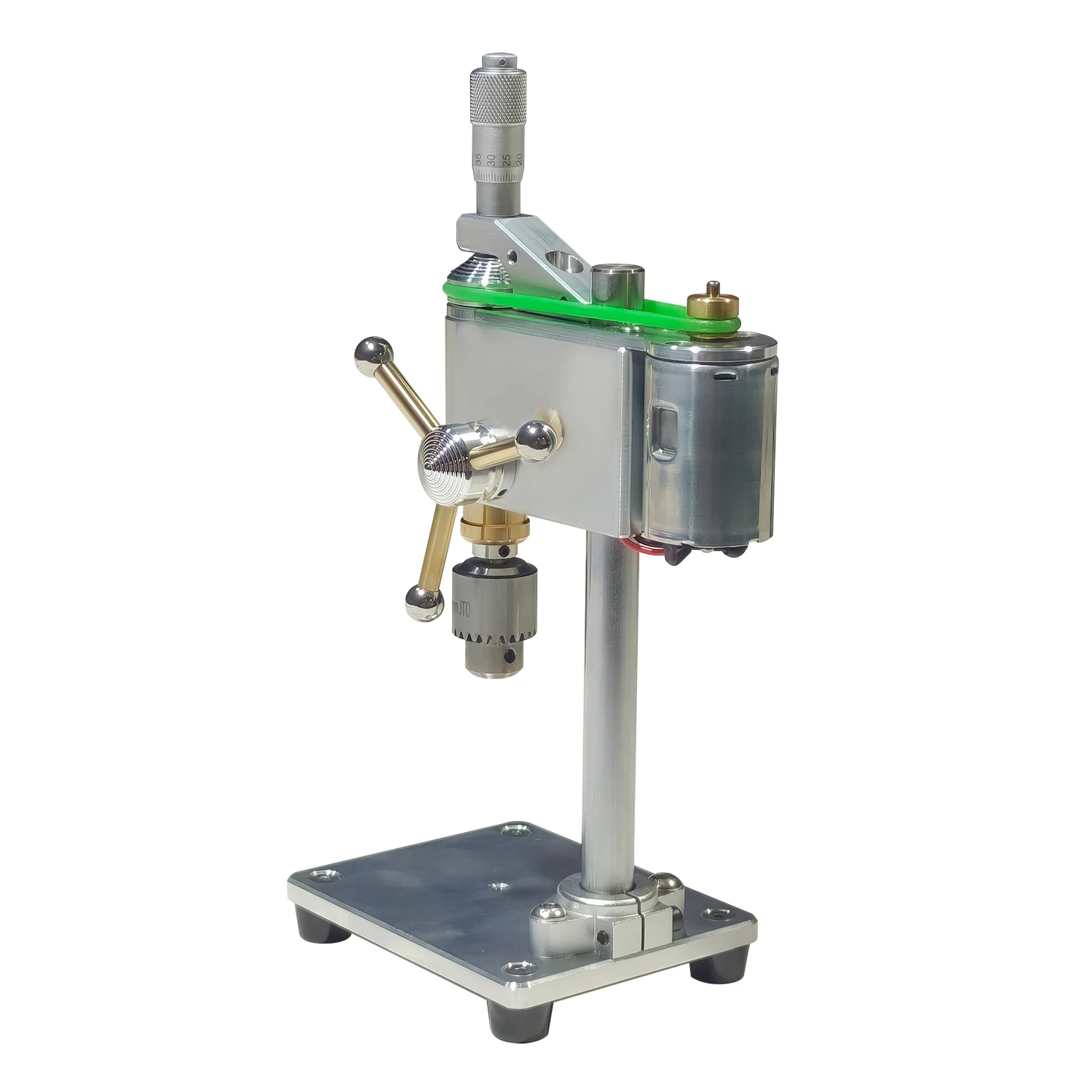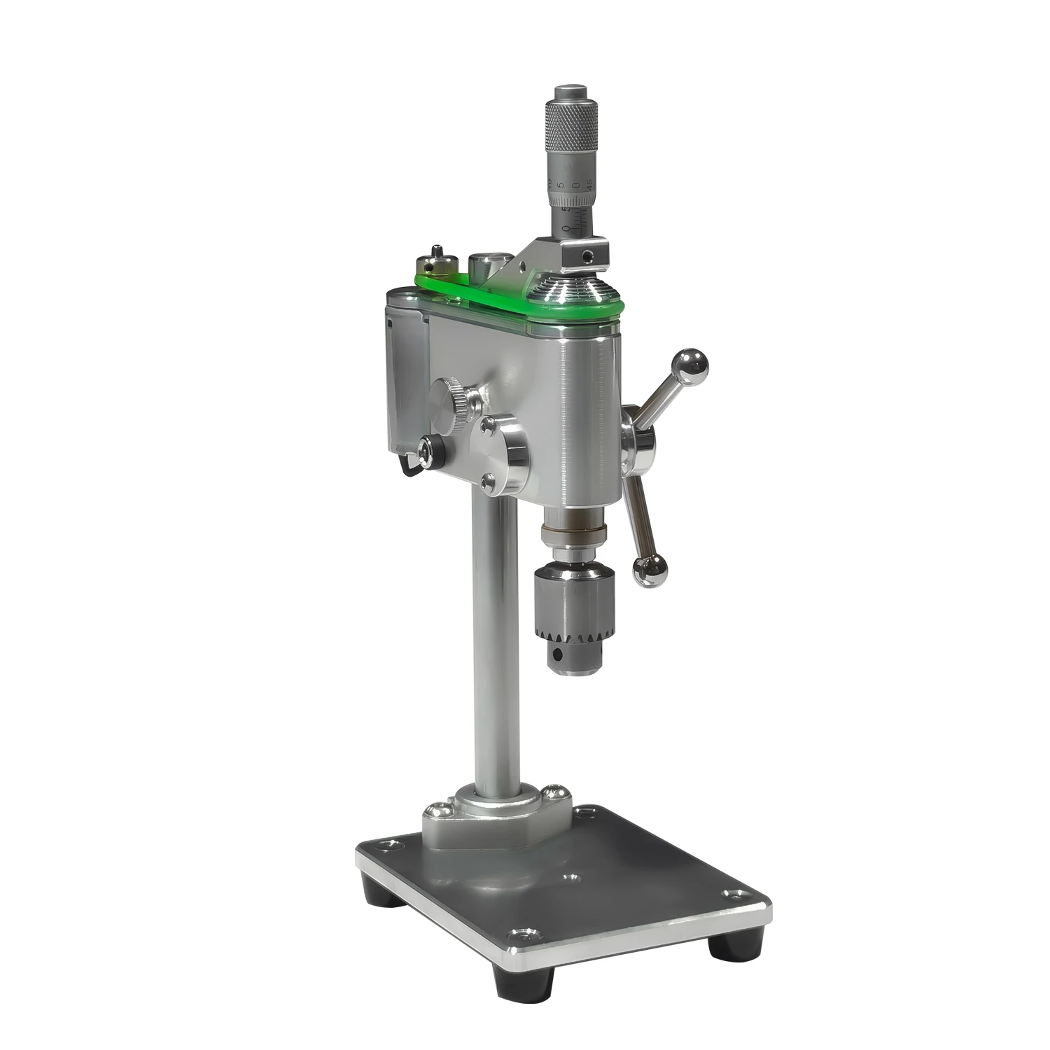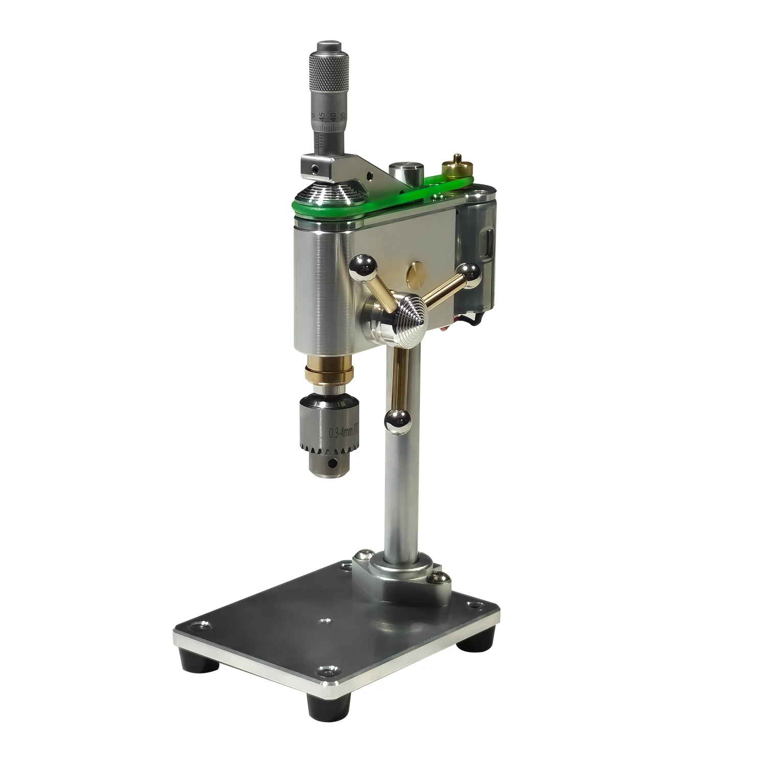 Experience the ultimate in metal drilling precision with this this mini electric bench drill. Crafted with a sleek industrial design, it features a smooth silver or gray metallic finish that reflects durability and craftsmanship. The rectangular motor housing with rounded edges offers a modern look, while the textured, knurled adjustment knobs provide tactile control for precise depth setting. The sturdy metallic column and stable rectangular base with rounded corners ensure stability during operation. Equipped with a high-quality cobalt steel alloy drill bit (size range 0.3-4mm), it delivers powerful, accurate performance for detailed metalworking projects. This CE-certified tool combines functionality, durability, and professional aesthetics, making it an essential addition to your workshop or professional setup.