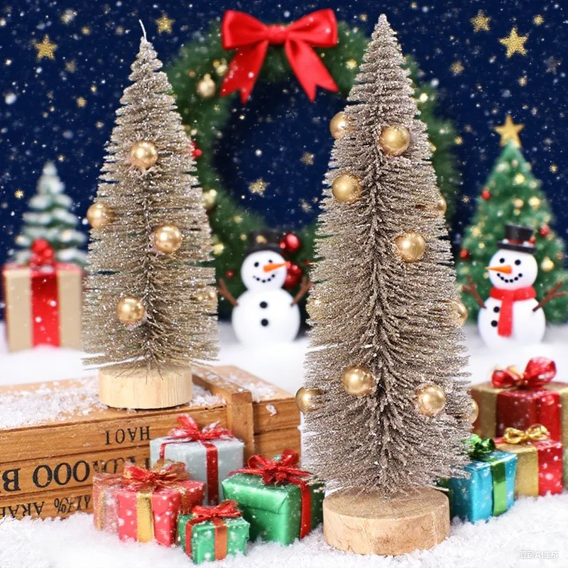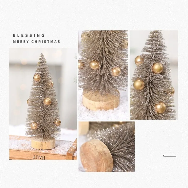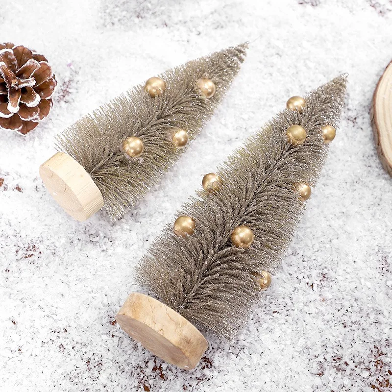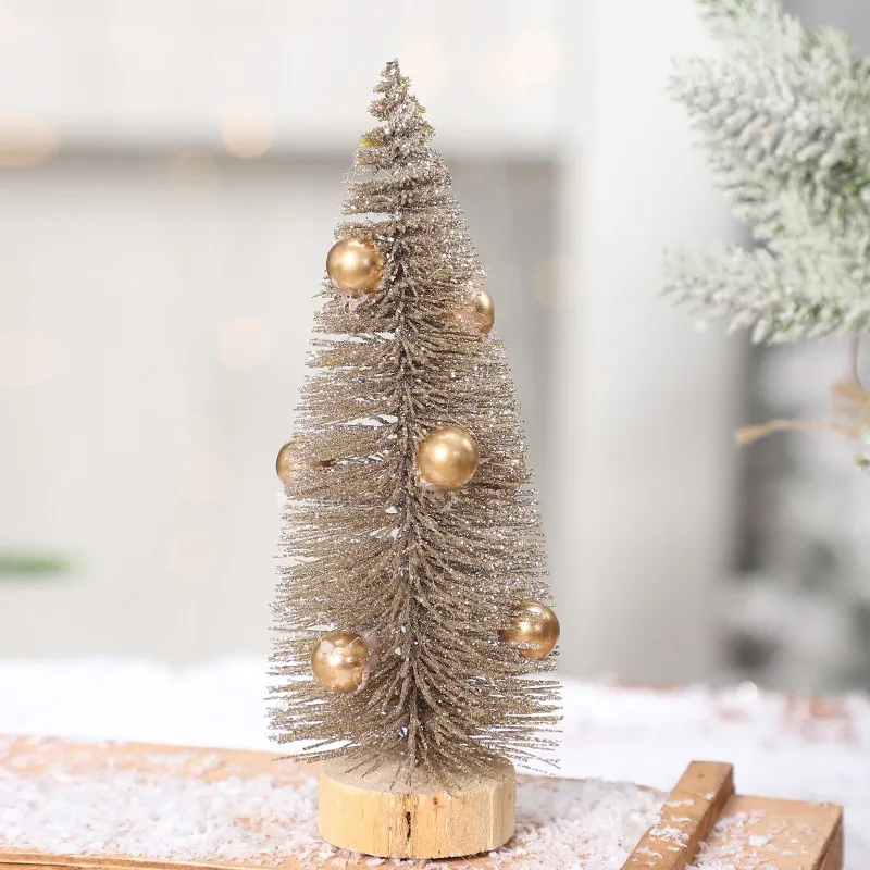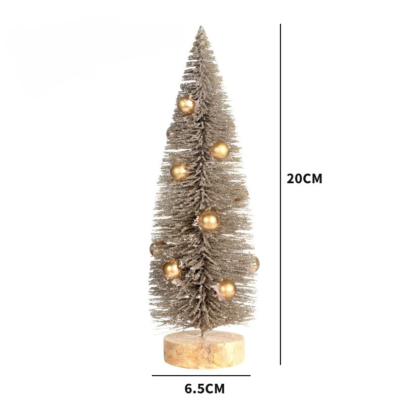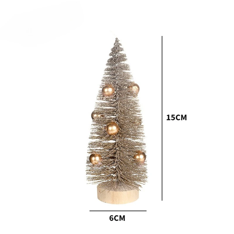 Transform your holiday decor with this elegant mini Christmas tree, measuring either 15cm or 20cm in height. Crafted with a conical shape that closely imitates a real pine tree, it's perfect for small spaces like desktops, countertops, or holiday centerpieces. The tree is made from a delicate thread-like material that mimics pine needles, coated with a shiny silver metallic finish to reflect festive lights and add a touch of sophistication. Gold-colored spherical ornaments are evenly spaced on the branches, creating a warm, luxurious contrast. The sturdy wooden base provides excellent stability while adding rustic charm. This charming miniature is a delightful addition to any holiday display, bringing a classic, festive atmosphere into your home or office.