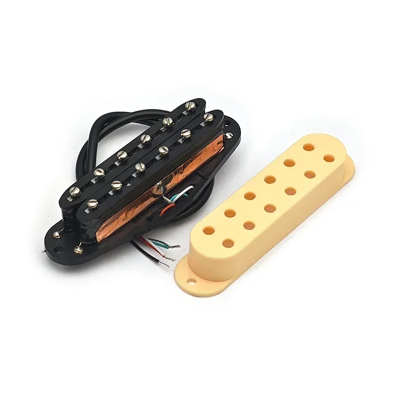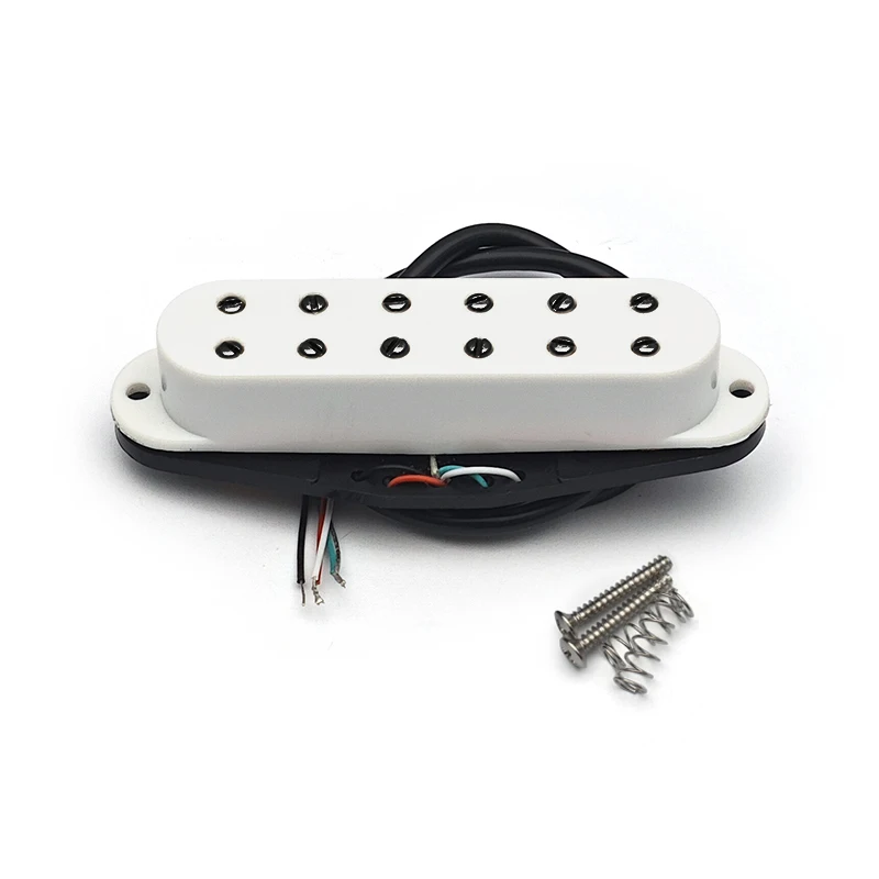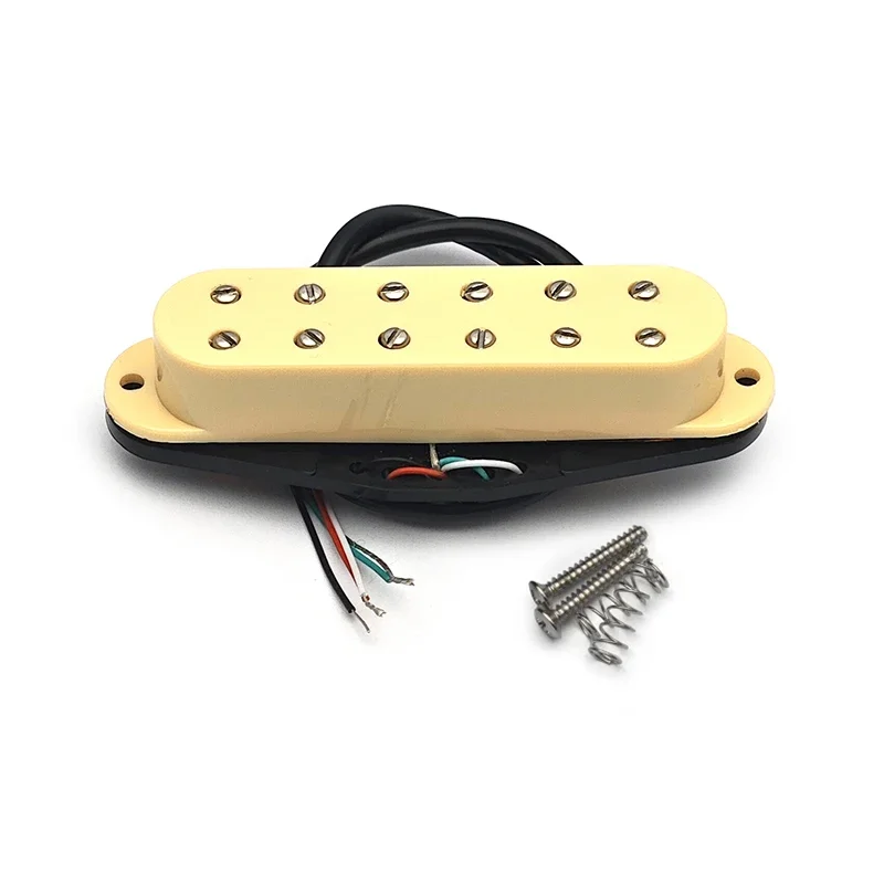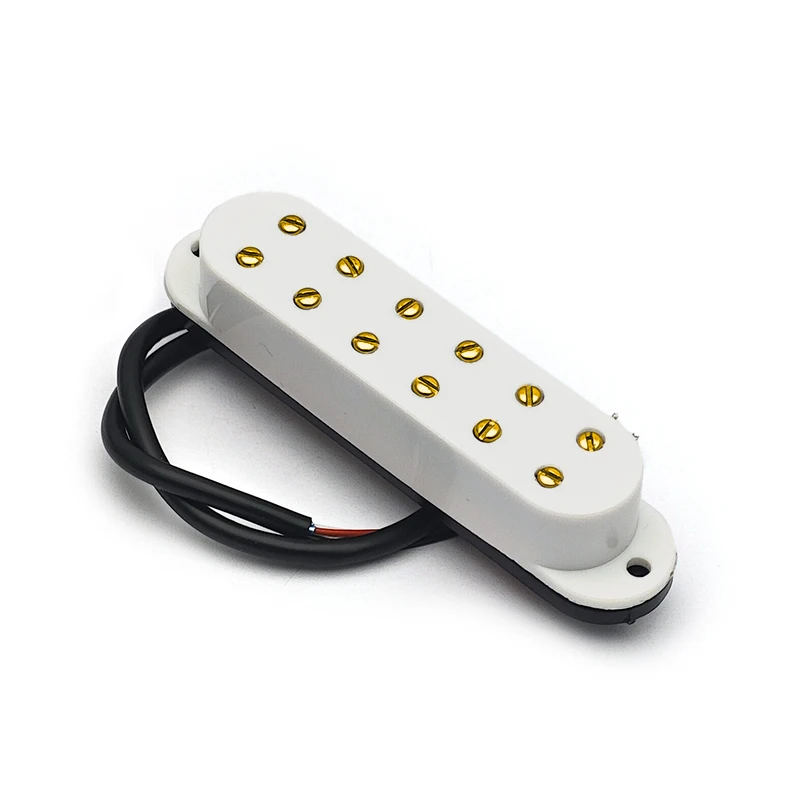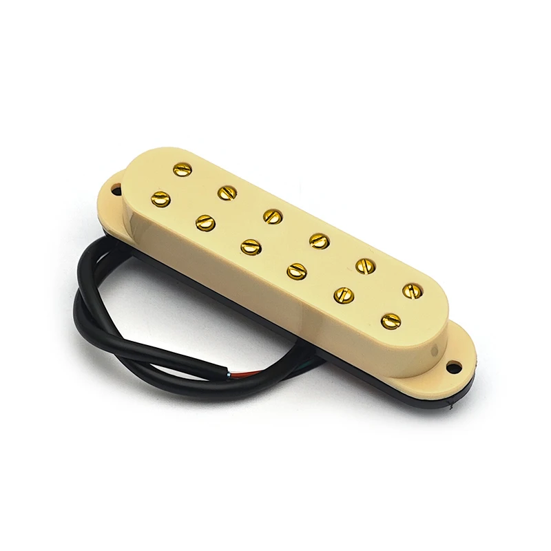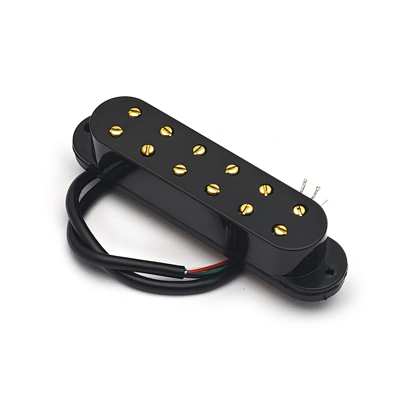 Experience enhanced tonal versatility with this 12-position adjustable pole piece mini humbucker pickup, designed with a resistance of 9K ±0.5K and featuring dual ceramic magnets for hum cancellation. Fully wax-potted and sealed, it offers durability and a bright, clear tone thanks to its thin gauge coil wire. The pickup has a standard Stratocaster single-coil size with a sleek black plastic bobbin and baseplate, providing a modern aesthetic with subtle metallic accents in color options like black, gold, and chrome screw finishes. The four-conductor shielded cable allows for coil splitting, giving you multiple wiring possibilities to suit your playing style.