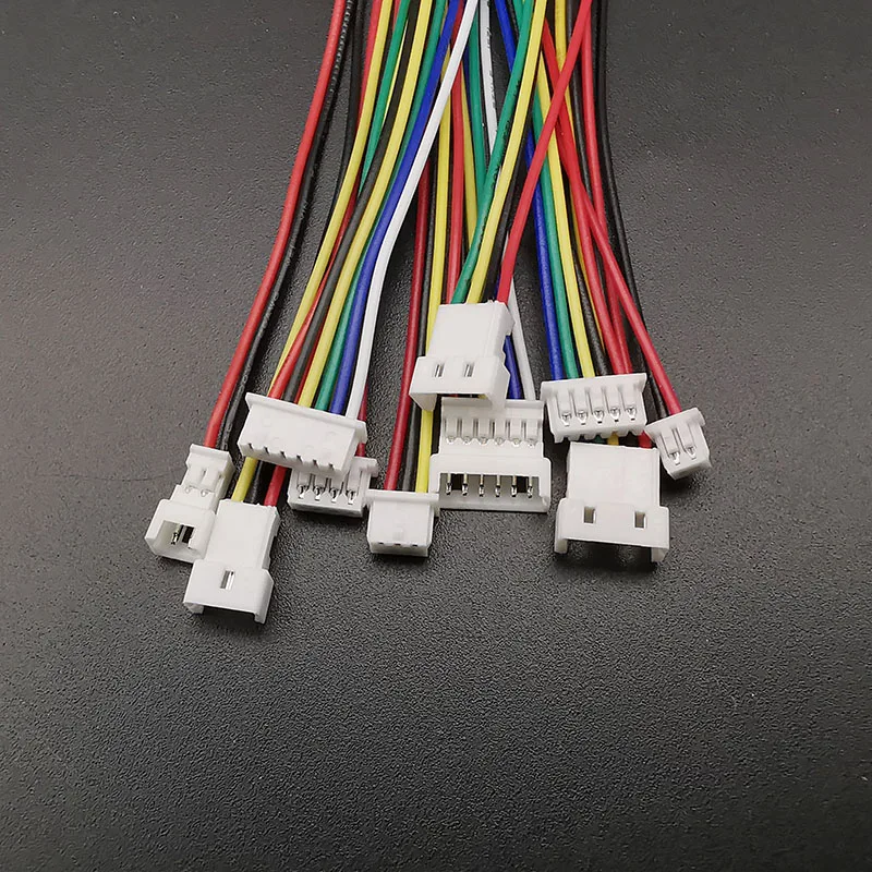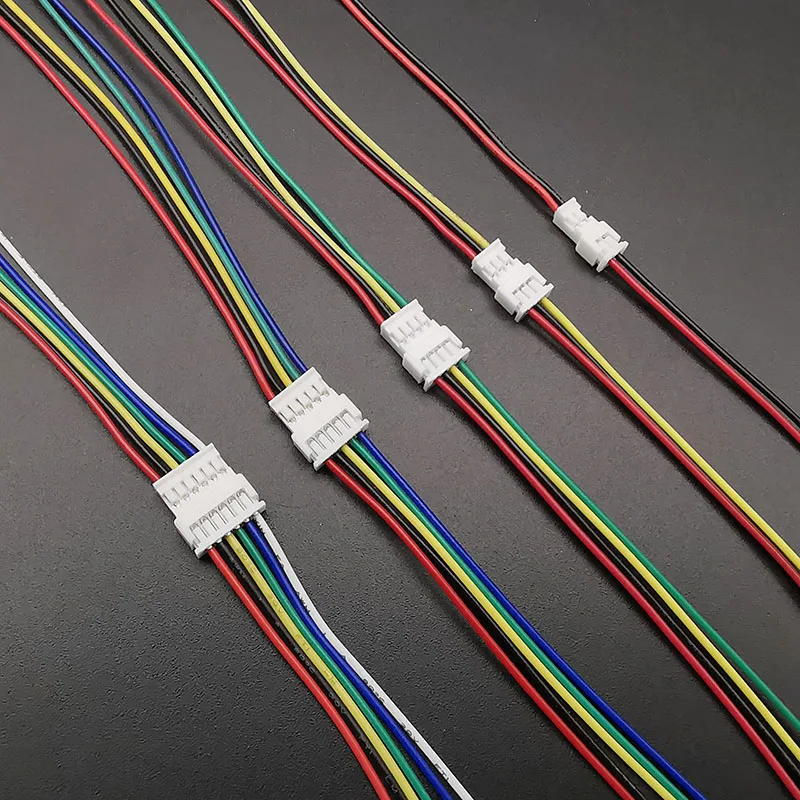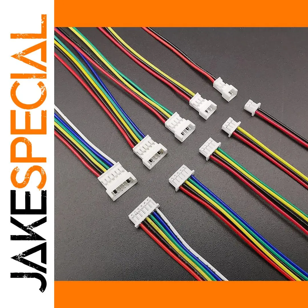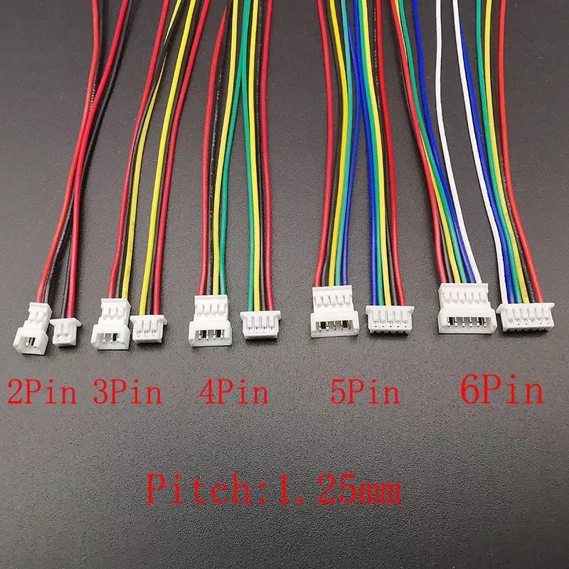 Experience versatility and precision with this this mini JST 1.25mm connector set, ideal for various DIY electronics projects. Each connector features a sleek white plastic housing with exposed metal contacts, creating a minimalist yet functional aesthetic. The vibrant, multi-colored wires in red, black, yellow, green, blue, and white provide visual clarity and easy identification during assembly. With approximately 10 centimeters in length, these flexible wires attach to both male and female connectors across pin counts of 2, 3, 4, 5, and 6 pins. This set guarantees reliable power and signal transmission for robotics, lighting, PCB control panels, toys, and batteries, blending technical accuracy with a clean, organized appearance, suitable for professional or hobbyist applications.