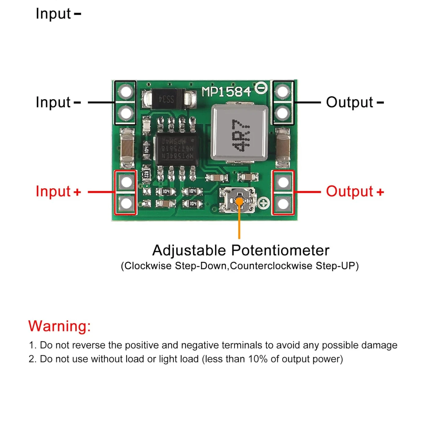 Optimize your power management with this compact MP1584EN-based DC-DC buck converter module, capable of delivering up to 3A with a maximum efficiency of 92%. Its small size of 22mm x 17mm x 4mm makes it ideal for space-constrained projects, providing adjustable output voltage from 0.8V to 20V and operating across a wide input range of 4.5V to 28V. Designed for durability, it functions efficiently within temperatures from -45°C to 85°C, with output ripple below 30mV and switching frequencies up to 1.5 MHz. Perfect for powering computers, embedded systems, or custom electronics.