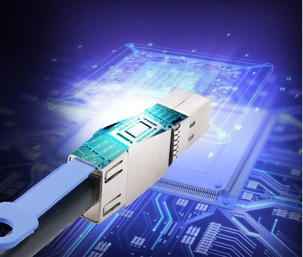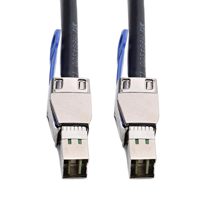 - Features high-density SFF-8644 connectors with beveled rectangular shape, metallic silver finish, and internal pins for optimal high-speed data transfer.
