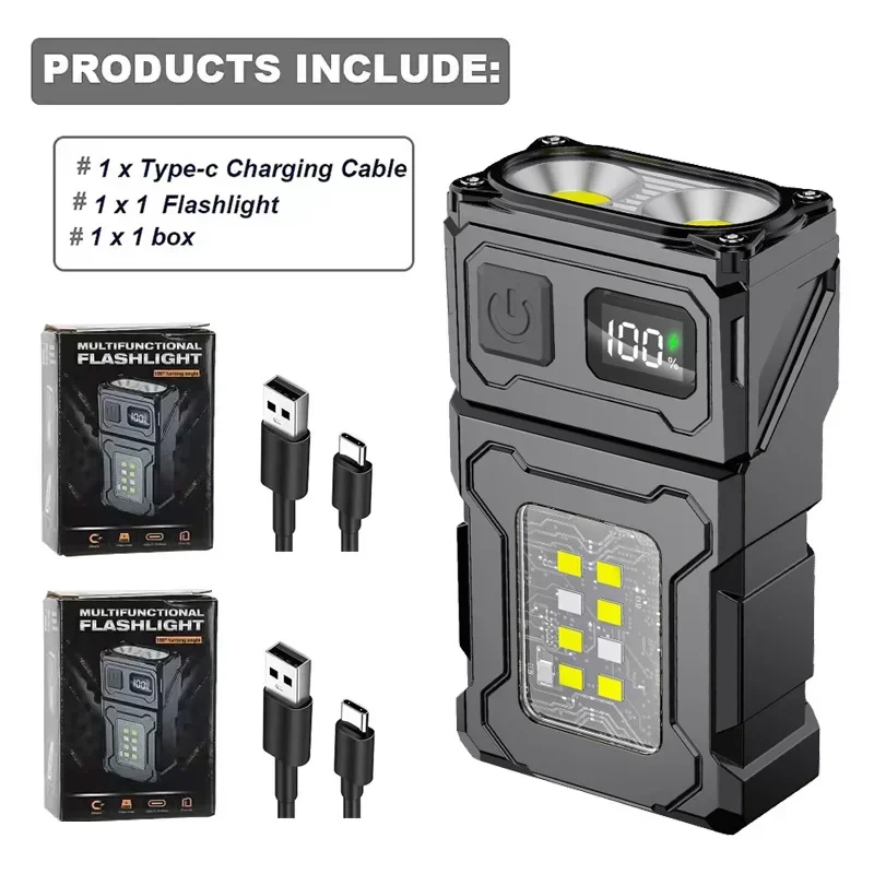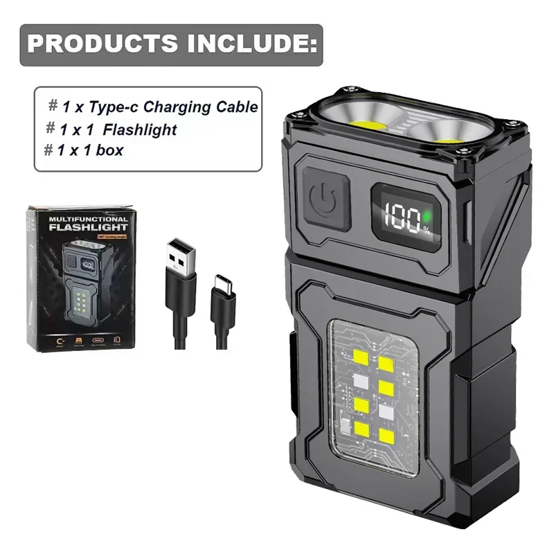 Experience the power of the mini flashlight that combines versatility and convenience for your outdoor activities. With its super bright LED and COB lights, this portable flashlight is designed to illuminate your surroundings. Equipped with a rechargeable lithium battery, it boasts multiple light modes including strong, middle, and flash settings. The sturdy design includes a tail magnet, allowing for hands-free operation, making it perfect for camping, hiking, and emergency situations. Additionally, the type-C charging feature ensures it is quick and easy to recharge, providing a reliable light source wherever you go.