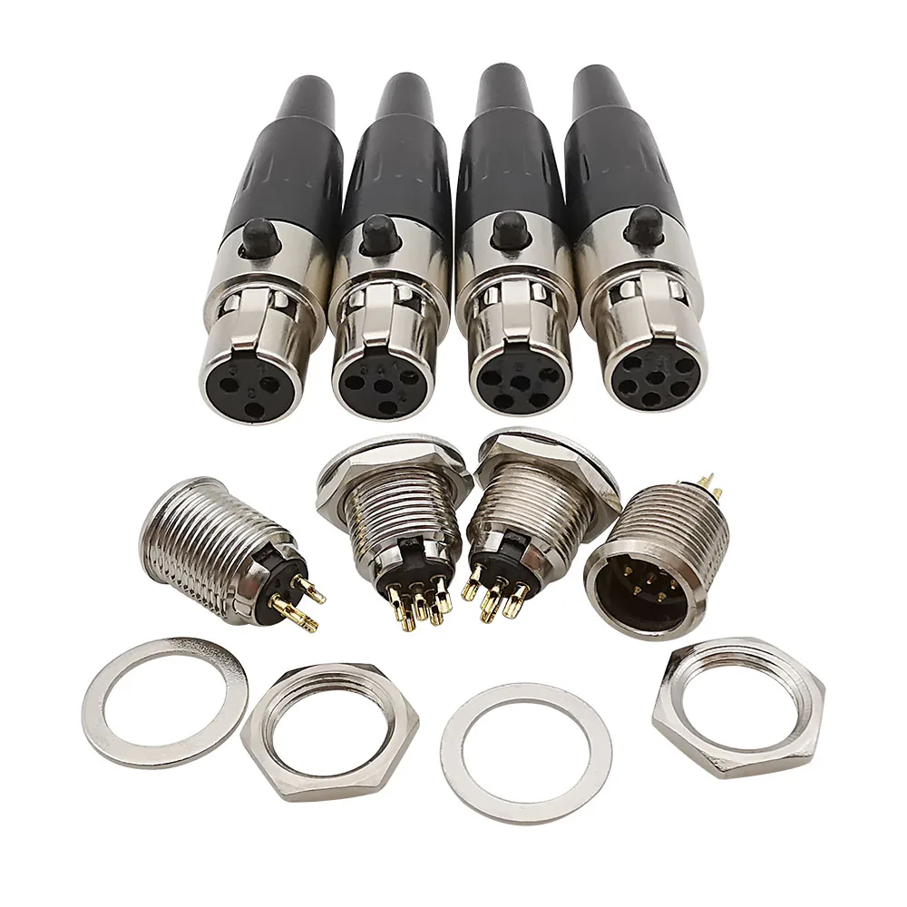 Imagine having a reliable and sleek connection for your audio and microphone projects with this set of Mini XLR connectors. Crafted with high-quality metal and durable plastic, these connectors boast a polished metallic finish combined with a glossy black exterior, ensuring both style and strength. Their straight chassis panel mount design makes installation straightforward and secure, perfect for professional audio setups or custom electronics. Whether you're working on microphones, amplifiers, or other audio electronics, these connectors provide a compact, high-reliability solution. The set includes options in 3-pin, 4-pin, 5-pin, or 6-pin configurations, with gender options of male and female, offering flexibility for your specific needs. Their precision engineering guarantees a solid connection every time, making your audio setup both efficient and dependable.