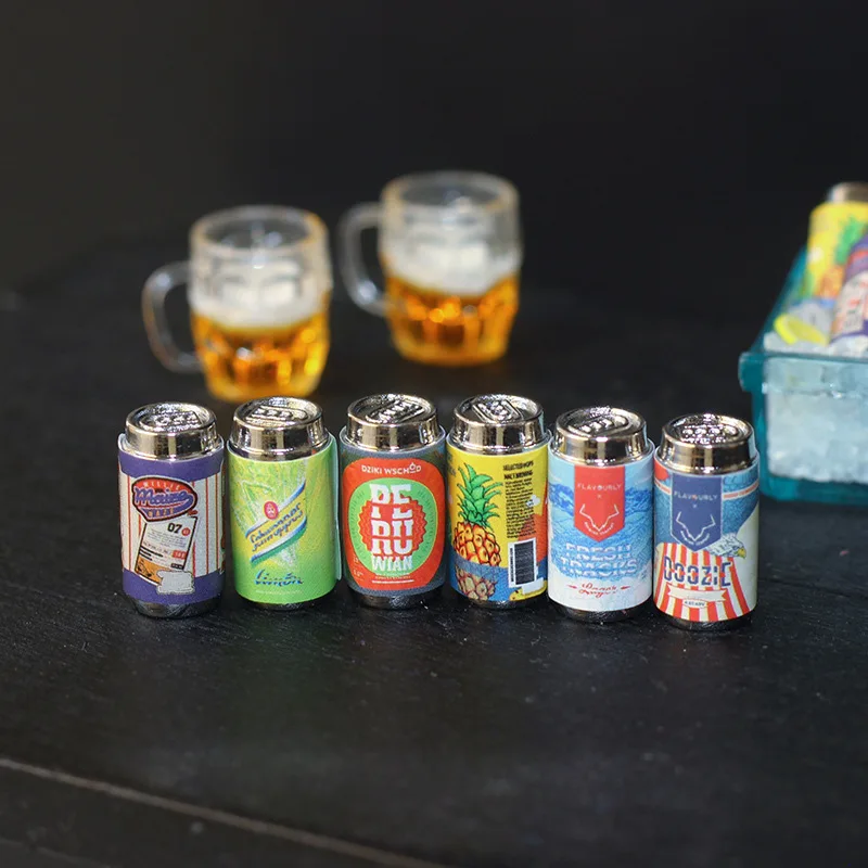 Imagine adding a lively touch to your dollhouse scene with this set of six miniature beverage cans. Expertly crafted from alloy, each can features vibrant, detailed labels resembling real soda, juice, or cocktail cans, complete with stylized logos and colorful graphics in red, yellow, blue, purple, and green. The shiny metallic finish creates an authentic look that captures the essence of real beverage packaging. Perfect for enhancing dollhouse setups or doll displays, these small cans bring a playful yet realistic vibe. With customizable stickers included, you can add personal touches like fruit images or brand accents. Elevate your miniature scenes with this fun, high-quality set designed for enthusiasts and collectors alike.