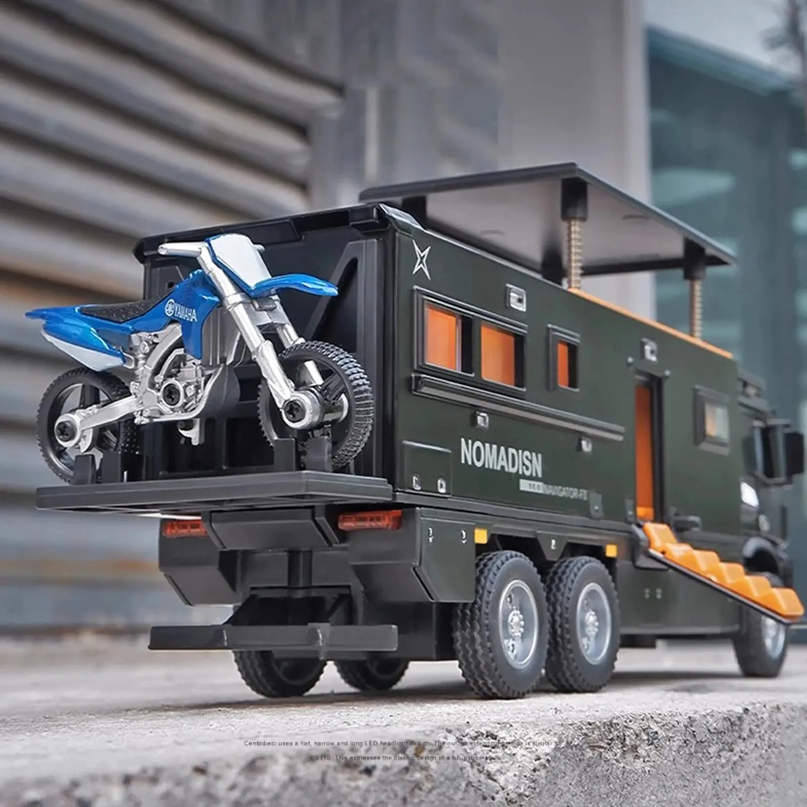 - Designed in a sleek black finish, accented with vibrant orange details on the door, windows, and decals, capturing the genuine visual aesthetic of the original camper RV.