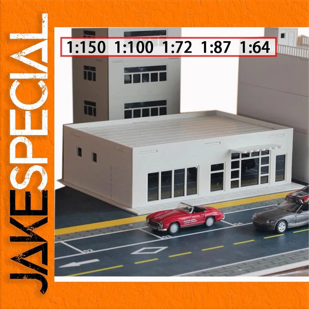 This miniature convenience store model is crafted from plastic and features a contemporary architectural design in a bright white color. It showcases a scale of 1:150, 1:100, 1:87, 1:72, and 1:64, with large black-framed glass windows and a detailed flat roof. The model includes smaller side windows and an awning, enhancing its realism, perfect for a street view scene. Assembly is required, and glue is needed to complete the build. Please note that car models are sold separately. Ideal for hobbyists interested in modern buildings and landscapes.