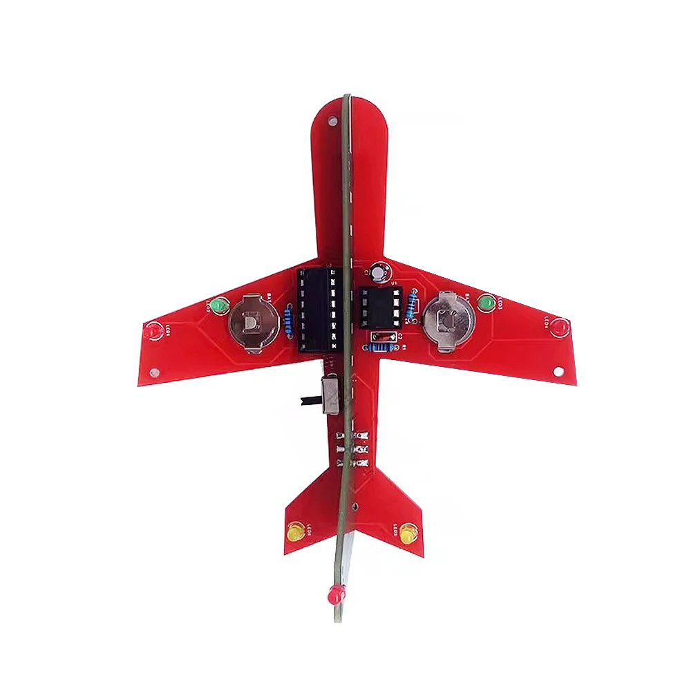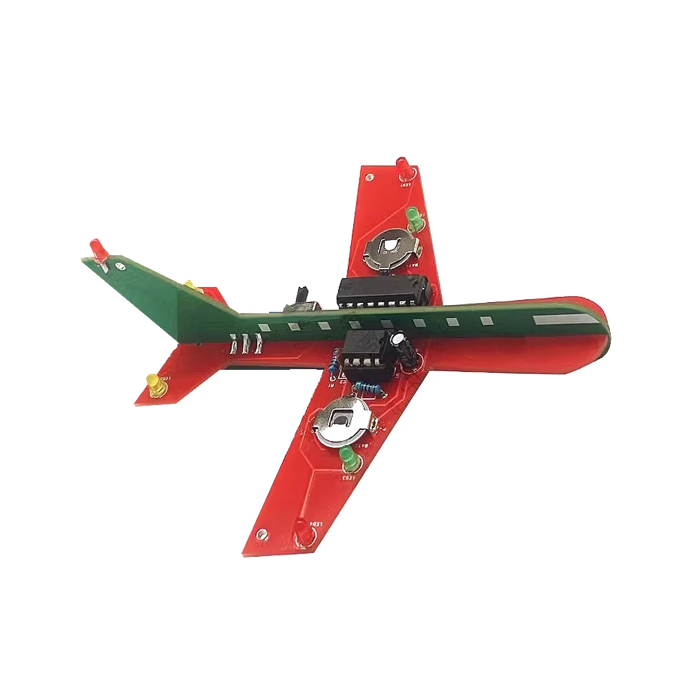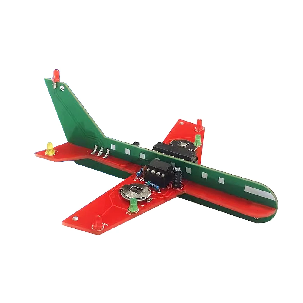 Transform your creative space with this charming electronic DIY kit designed to resemble a sleek, miniature airplane. Crafted with smooth, rounded shapes, the streamlined red fuselage boasts a polished finish, giving it a modern and polished appearance. Perched on each side are smaller green circuit boards mimicking wings and stabilizers, also with a refined, smooth surface. Bright yellow LEDs sit at the wingtips, while a vibrant green LED adorns one stabilizer, creating a lively, eye-catching effect when illuminated. The neatly soldered electronic components emphasize precision, blending technological sophistication with a playful, toy-like aesthetic. This kit invites you to build, learn, and enjoy a visually appealing project that sparks your imagination and offers a satisfying DIY experience, perfect for electronic enthusiasts and students alike.