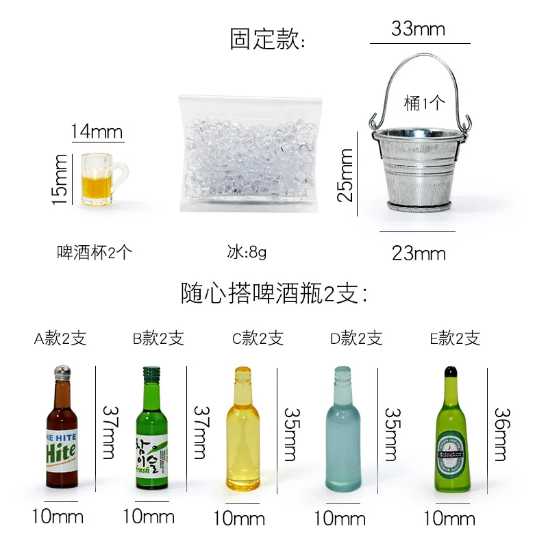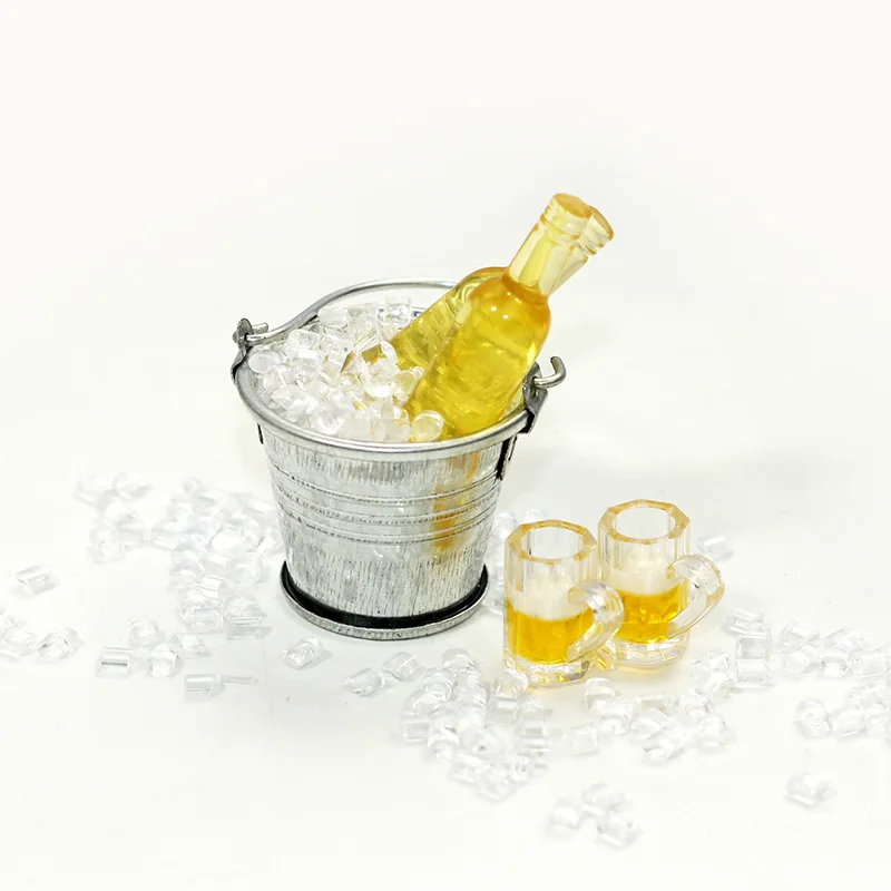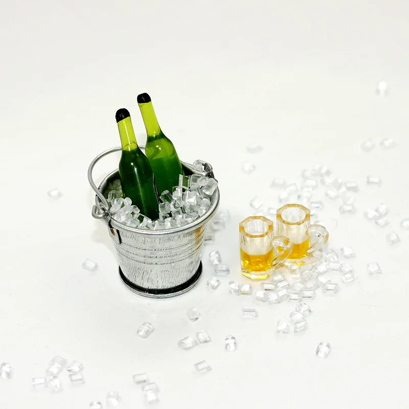 Step into a world of tiny, authentic beverage accessories with this beautifully crafted miniature dollhouse beer set. Designed with meticulous attention to detail, it features two transparent resin beer glasses with handles, topped with foam-like rims that mimic real frothy beer. The set also includes two vibrant green resin bottles labeled “Fresh” with white caps, alongside a shiny silver-colored alloy and resin ice bucket filled with irregularly shaped resin ice cubes. Scattered ice cubes on the surface add a refreshing, cool touch. Weighing just 22 grams, this set offers a realistic aesthetic, perfect for dollhouse enthusiasts who appreciate precision and high-quality miniature details. Create an immersive scene or display these realistic accessories for a lifelike vibe.