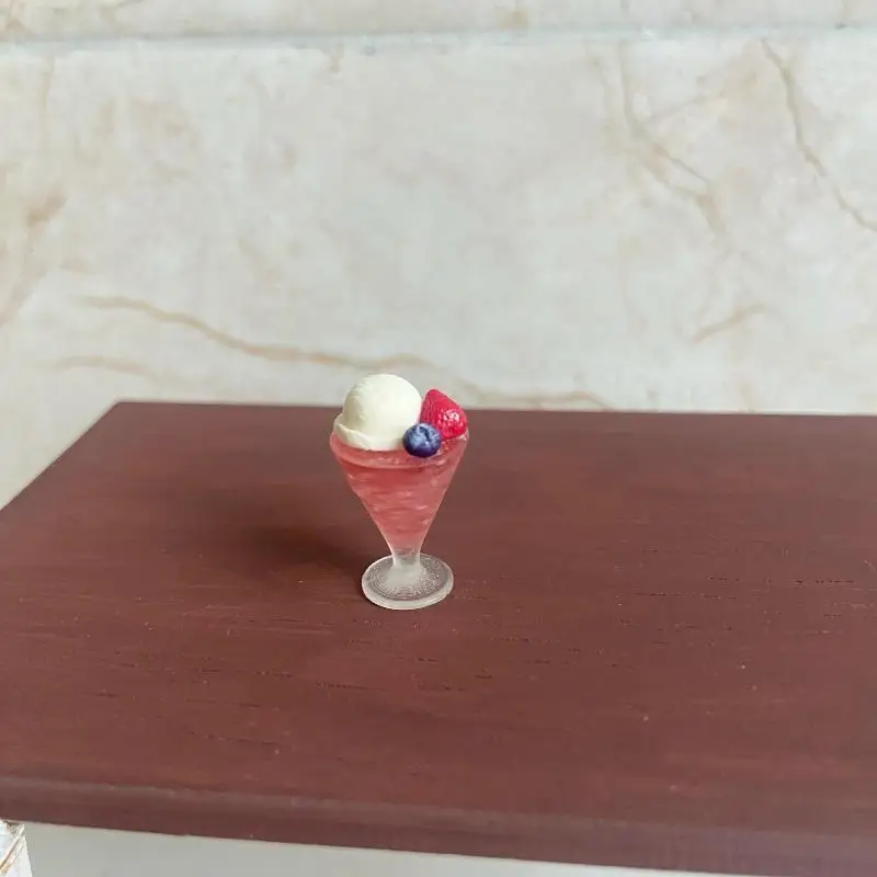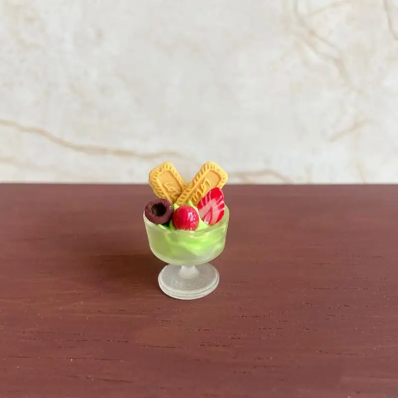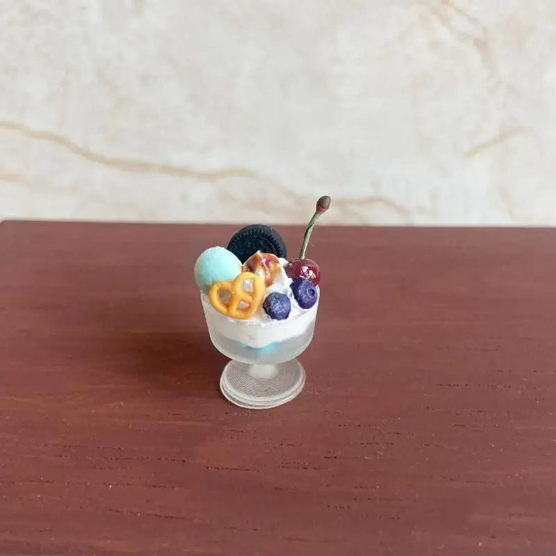 Experience the delightful charm of this this set of four miniature dollhouse ice cream and ice drink models, each about 3 centimeters tall. These intricately crafted pieces feature vibrant, realistic colors and textures that mimic real desserts, including creamy whites, vivid greens, cool blues, and warm chocolate shades. The detailed toppings, like tiny cherries, wafer cookies, fruit spheres, and decorative confections, add a playful and appetizing touch. Each model comes in a clear glass cup, enhancing their delicate and sophisticated appeal. Perfect for adding a touch of culinary realism to your dollhouse or as a charming gift for collectors, these miniatures will bring your miniature scenes to life with their colorful charm and meticulous detailing.