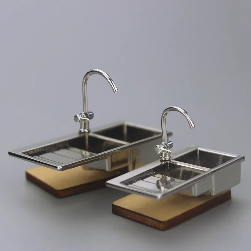 Enhance your dollhouse with this realistic 1:12 scale miniature simulation faucet set, crafted from durable metal. Featuring sleek black and silver options, the set includes a double sink dish with a glossy white finish that mimics real porcelain. The minimalist design, with curved faucet spouts mounted on a light-colored rectangular backplate, brings authentic detail to your dollhouse kitchen. Perfect for DIY enthusiasts aged 14 and above, the faucet set combines safety and quality with CE and 3C certifications. Create a lifelike miniature kitchen environment that adds charm and realism to your dollhouse collection, elevating your display with meticulous craftsmanship and stylish functional details.
