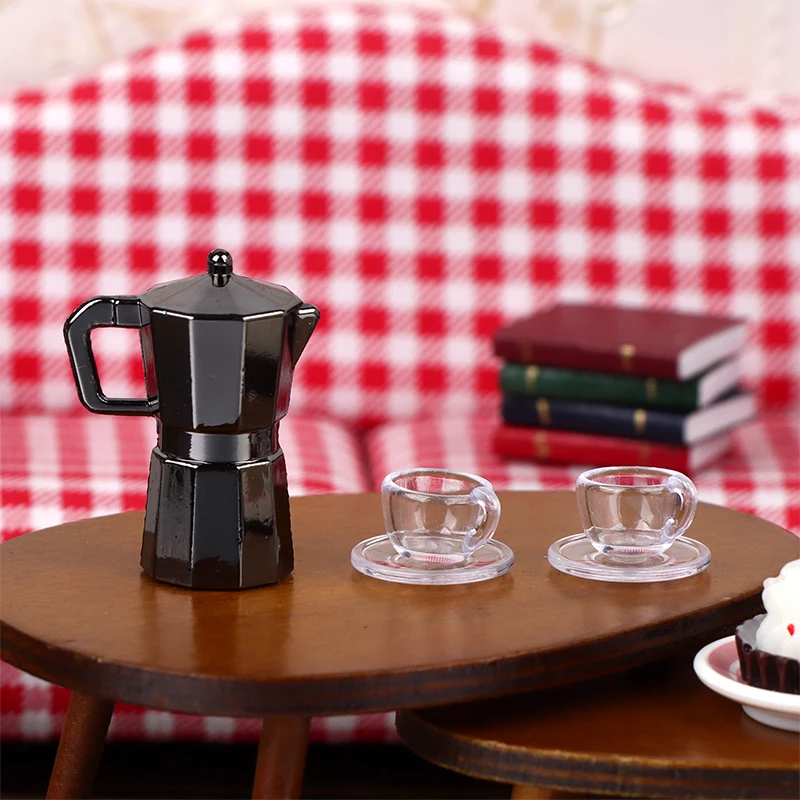 - Includes one small moka pot, two clear plastic cups with handles, and two matching trays—ideal for serving or display within your miniature kitchen setting.