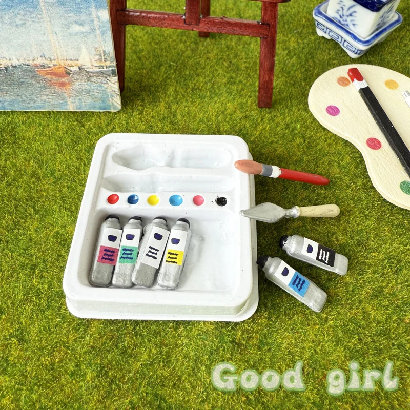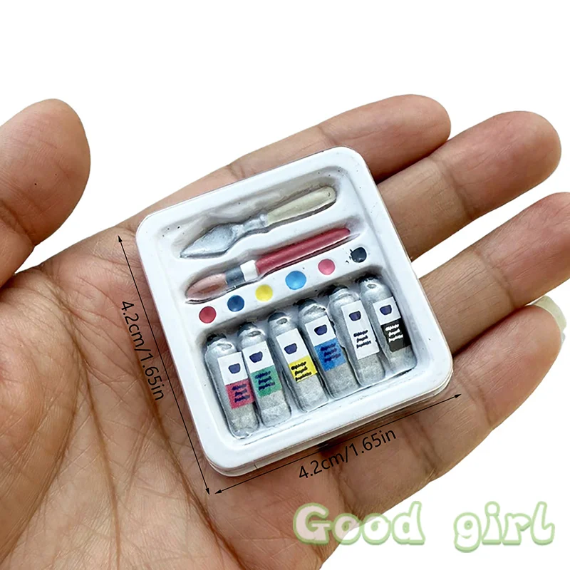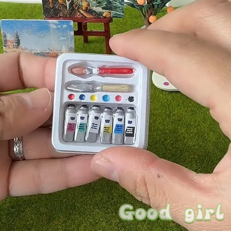 - Inside, it contains six tiny paint tubes labeled with vibrant colors—purple, green, yellow, blue, pink, and black—each with fine, realistic printing to mimic actual paint labels.