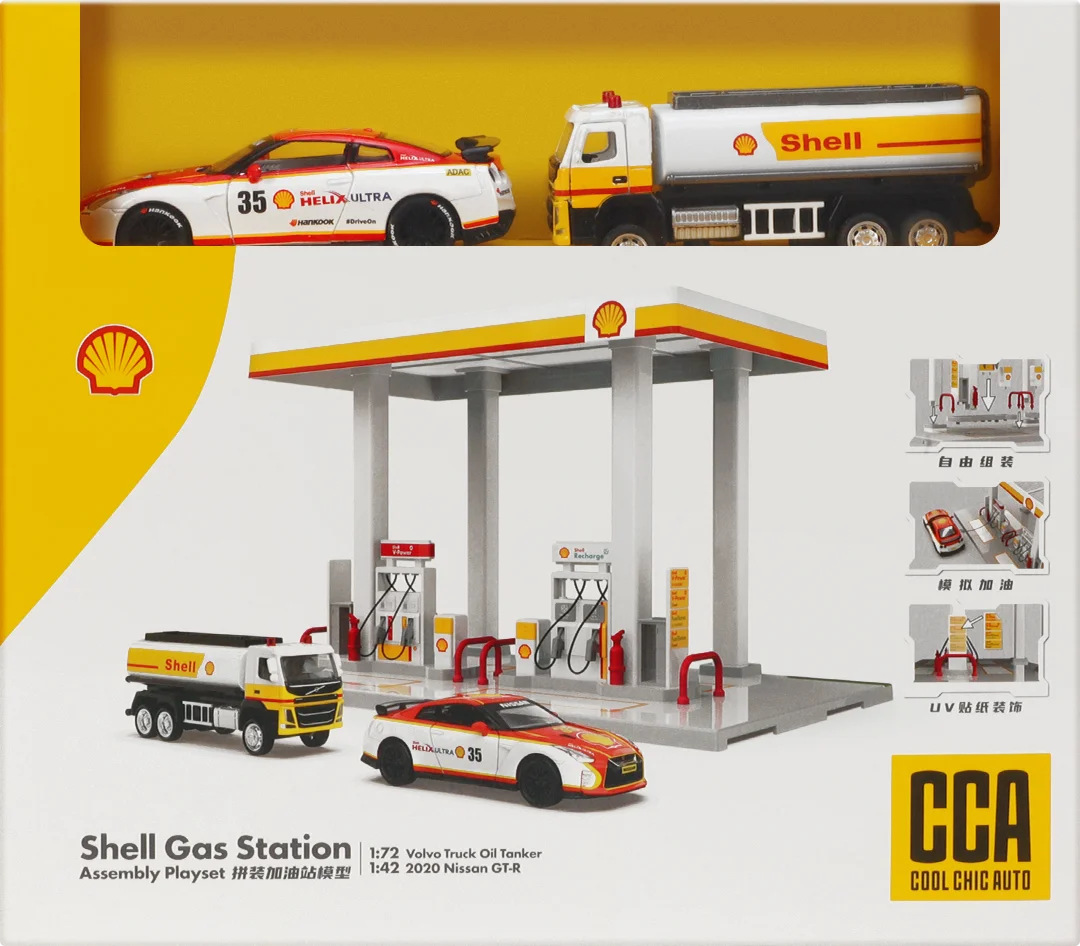 - Components include a modern gas station structure, fuel dispensers with realistic hoses, and a selection of scaled vehicles such as racing, sports, and tanker trucks.