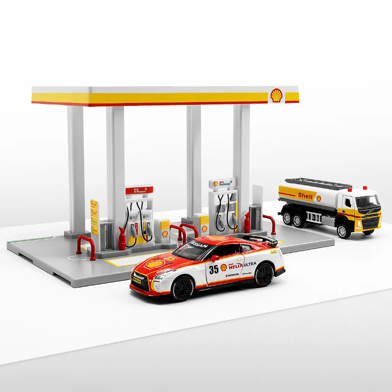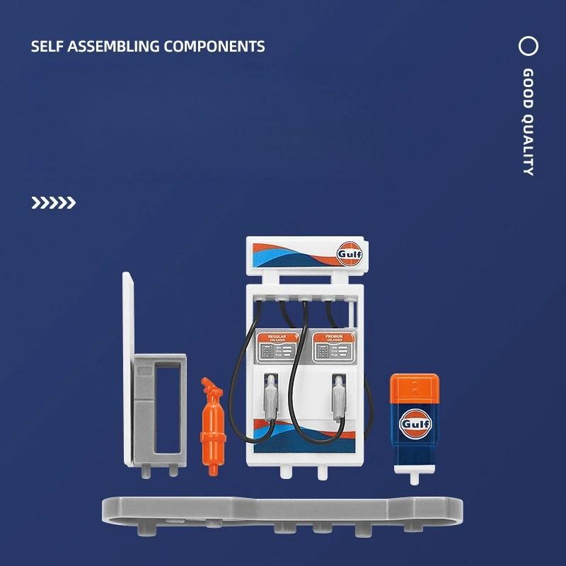Create an engaging, realistic miniature scene with this diecast alloy gas station model kit, available in Gulf and Shell branding. Designed for ages 14 and up, the assembly set features a detailed, non-electrical refueling machine that can be customized through DIY construction. The sturdy metal construction provides durability and authenticity, with vivid white structures accented by bright yellow bands and bold red stripes on the main canopy. Complete with fuel dispensers, hoses with red handles, and realistic branding labels, this kit also includes a sleek red-and-white alloy car with racing decals. Perfect for collectors and enthusiasts seeking a vivid, sporty aesthetic in their miniature scenes.