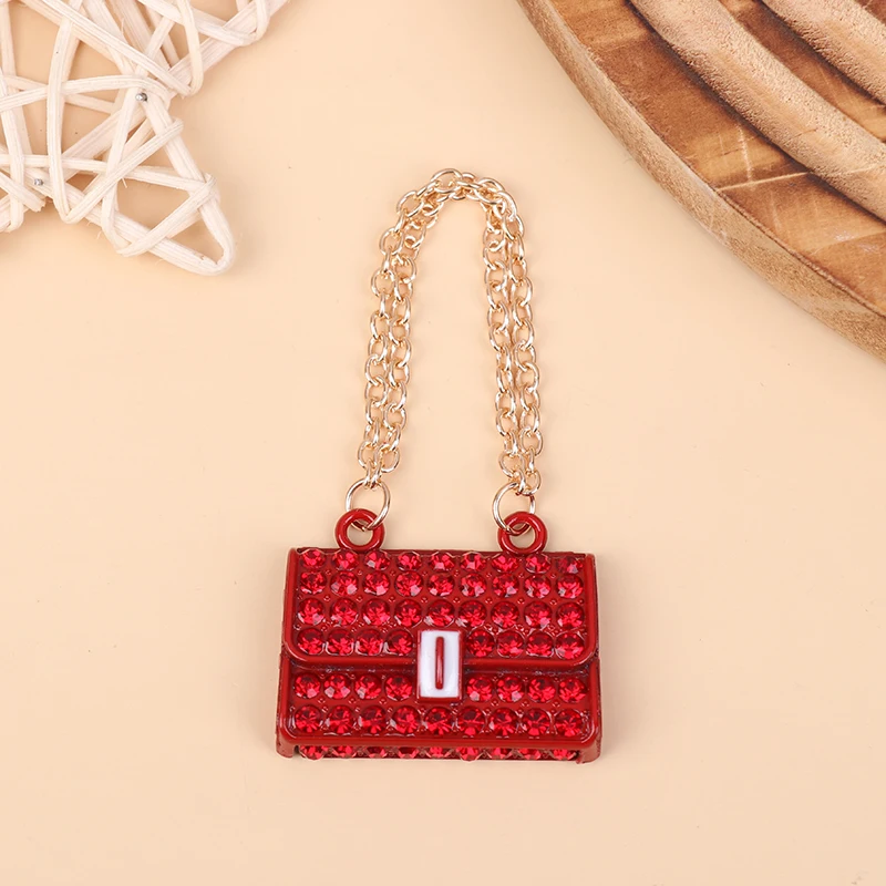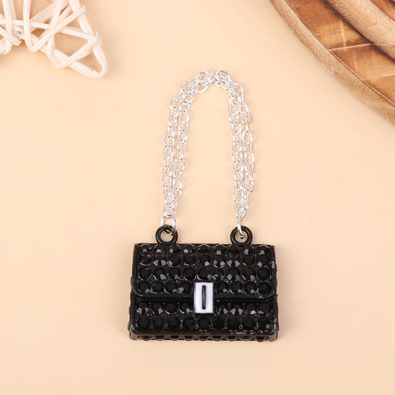 Step into the world of miniature luxury with this stunning dollhouse metal chain handbag, crafted with exceptional detail and craftsmanship. Measuring approximately 3.55 x 2.8 centimeters, this glamorous accessory offers a realistic and elegant touch to any dollhouse scene. Its glossy, leather-like finish enhances its sophisticated look, while the rhinestone embellishments in pink, black, red, and white add a sparkling, high-fashion appeal. The silver chain strap perfectly complements the rectangular shape, creating an authentic handbag aesthetic on a tiny scale. Perfect for collectors and enthusiasts eager to elevate their miniature displays, this finely crafted handbag is a versatile addition that captures the essence of chic, glamorous style, adding an eye-catching element to any scene.