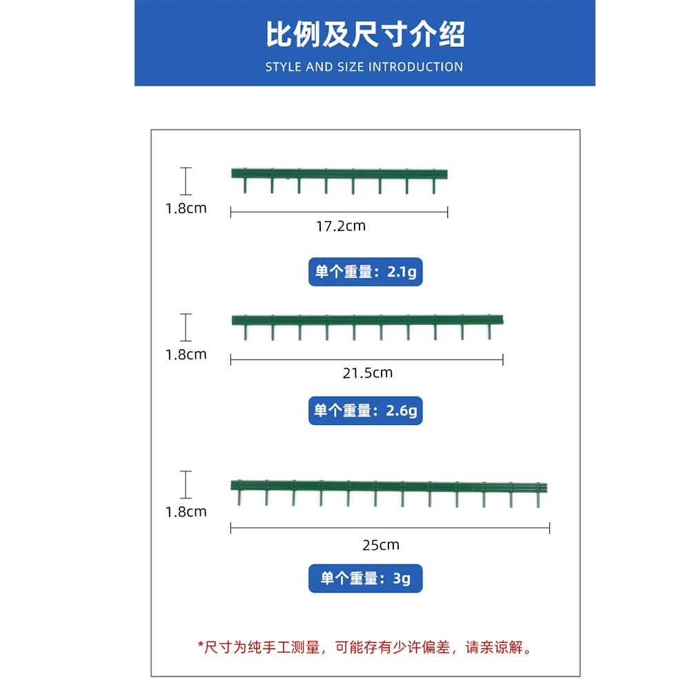 - Each guardrail measures approximately 1.8 cm in height with lengths of 17 cm, 21 cm, and 25 cm, perfectly scaled for model railway or diorama layouts.