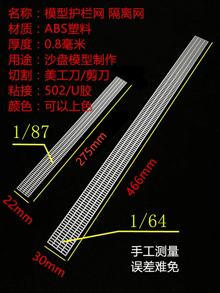 Enhance your railway train layout with these miniature rectangular grid guardrails available in 1/64 and 1/87 scales. Crafted from lightweight ABS plastic with a height of 0.8mm, these white guardrails feature a precise rectangular grid pattern with evenly spaced straight lines, adding realistic detail to your architectural and train models. The 1/87 scale measures 275mm x 22mm, while the 1/64 scale is 466mm x 30mm, designed for DIY model enthusiasts aged 14 and above. Their clean, minimalist design seamlessly integrates into detailed miniature scenes, providing both functionality and aesthetic appeal for your layouts.