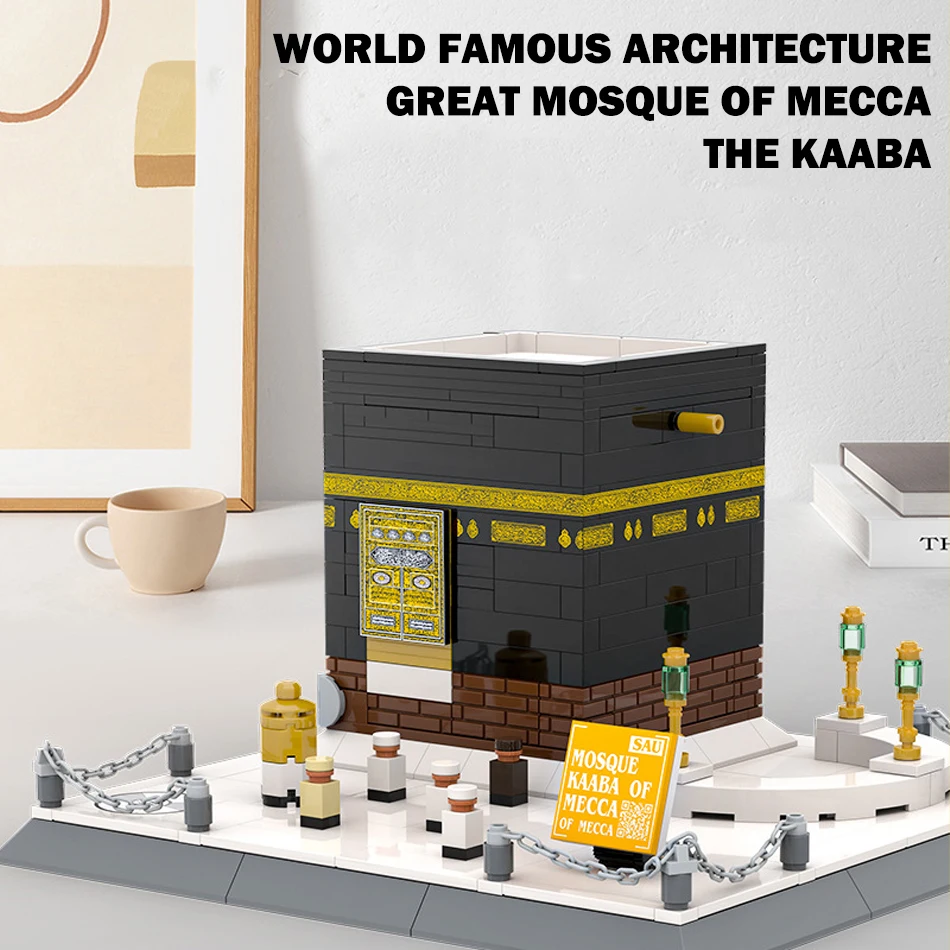 Imagine having this beautifully crafted miniature of the Kaaba right in your collection. Made from 446 eco-friendly ABS plastic pieces, this model captures every intricate detail of the sacred Islamic site. The black surface mimics the actual Kaaba’s appearance, accented with a stunning gold-colored band adorned with detailed embroidery patterns of the kiswah cloth. The model features a delicate door design in black and gold, symbolic of the structure’s significance. The base is composed of white, gray, and brown bricks that resemble a stone platform. Surrounding the structure is a refined white perimeter with tiny posts connected by chains, complemented by small gold lamp posts, creating a reverent and ornate display piece ready for assembly.