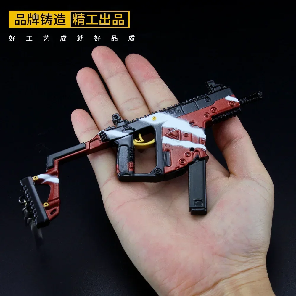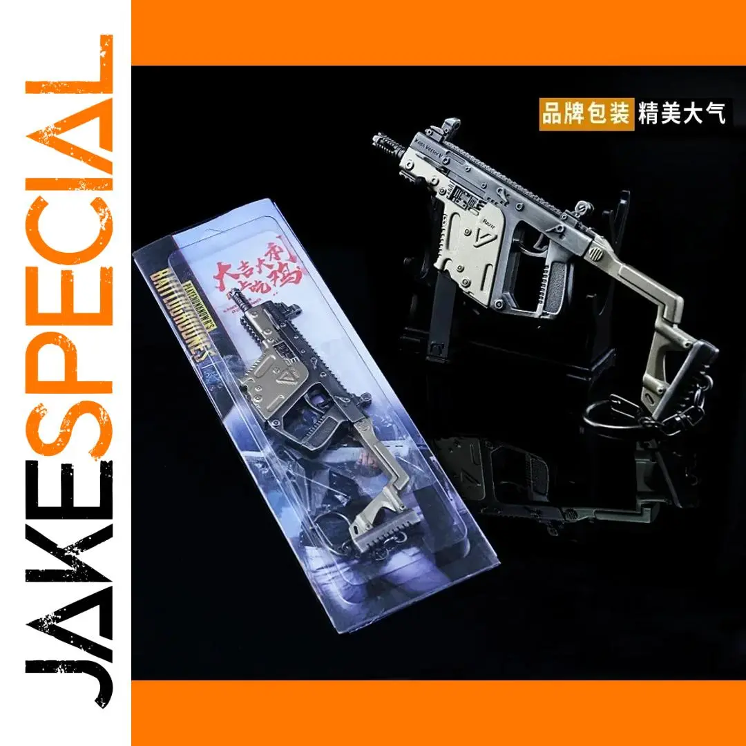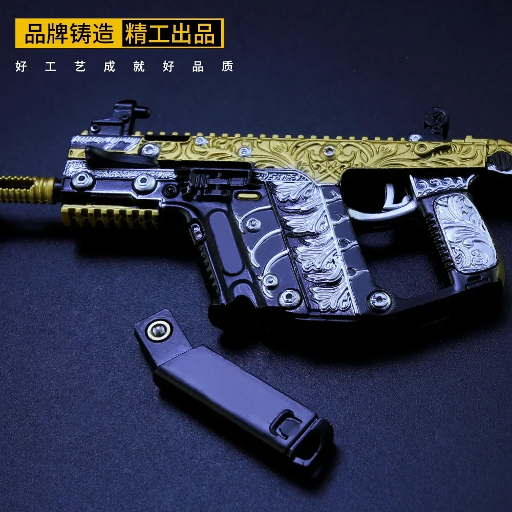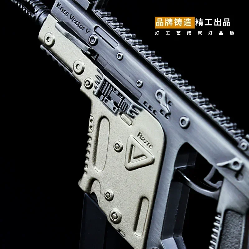 This meticulously crafted 14.5 cm miniature model of the KRISS Vector submachine gun is made from zinc alloy with an electroplated finish, featuring a sleek, modern yet nostalgic design with gunmetal gray and black tones. Weighing between 132 and 139 grams, it boasts intricate details such as a ribbed barrel, textured grip, angular stock with a cutout frame, and ridged rail systems, enhancing its realistic appearance. Designed as a PUBG-themed collectible, its polished metallic surface emphasizes a contemporary aesthetic. The model is not sharpened and is intended solely for display or accessory purposes. The weapon and display stand are sold separately, allowing you to customize your collection.