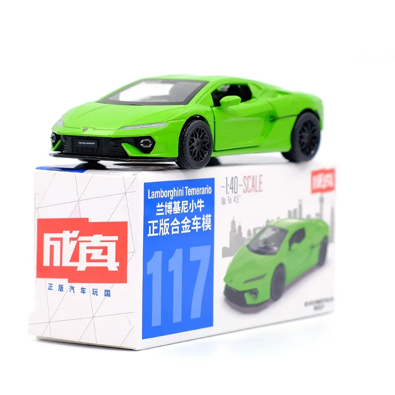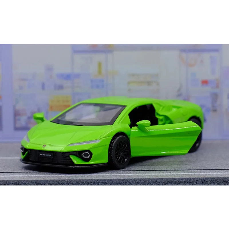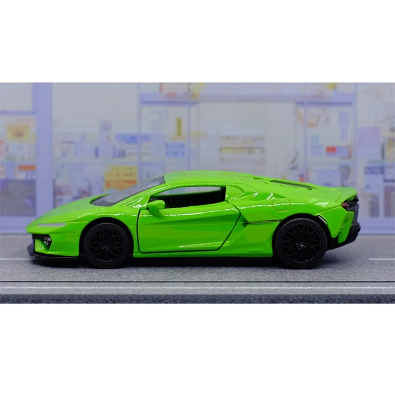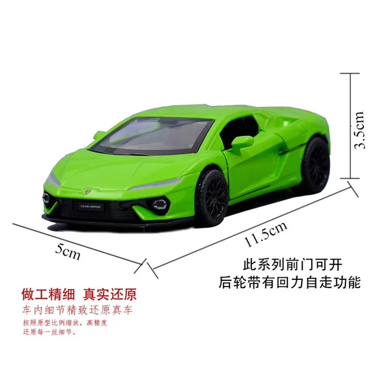 Experience the thrill of owning this expertly crafted miniature Lamborghini Temerario diecast model, designed for enthusiasts and collectors who appreciate precision and style. Measuring approximately 3.5 cm high, 11.5 cm long, and 5 cm wide, this compact replica boasts a vivid matte green color that immediately captures attention. The sleek, aerodynamic design features smooth curves, sharp lines, angular headlights, and a contoured hood that mirror the real sports car's aggressive aesthetics. Functional opening doors and a pull-back mechanism enhance playability and display appeal, while high-quality metal construction ensures durability. Whether on a shelf or in your collection, this model exudes a modern, high-performance vibe, making it perfect as a gift or educational piece for those aged 14 and above.