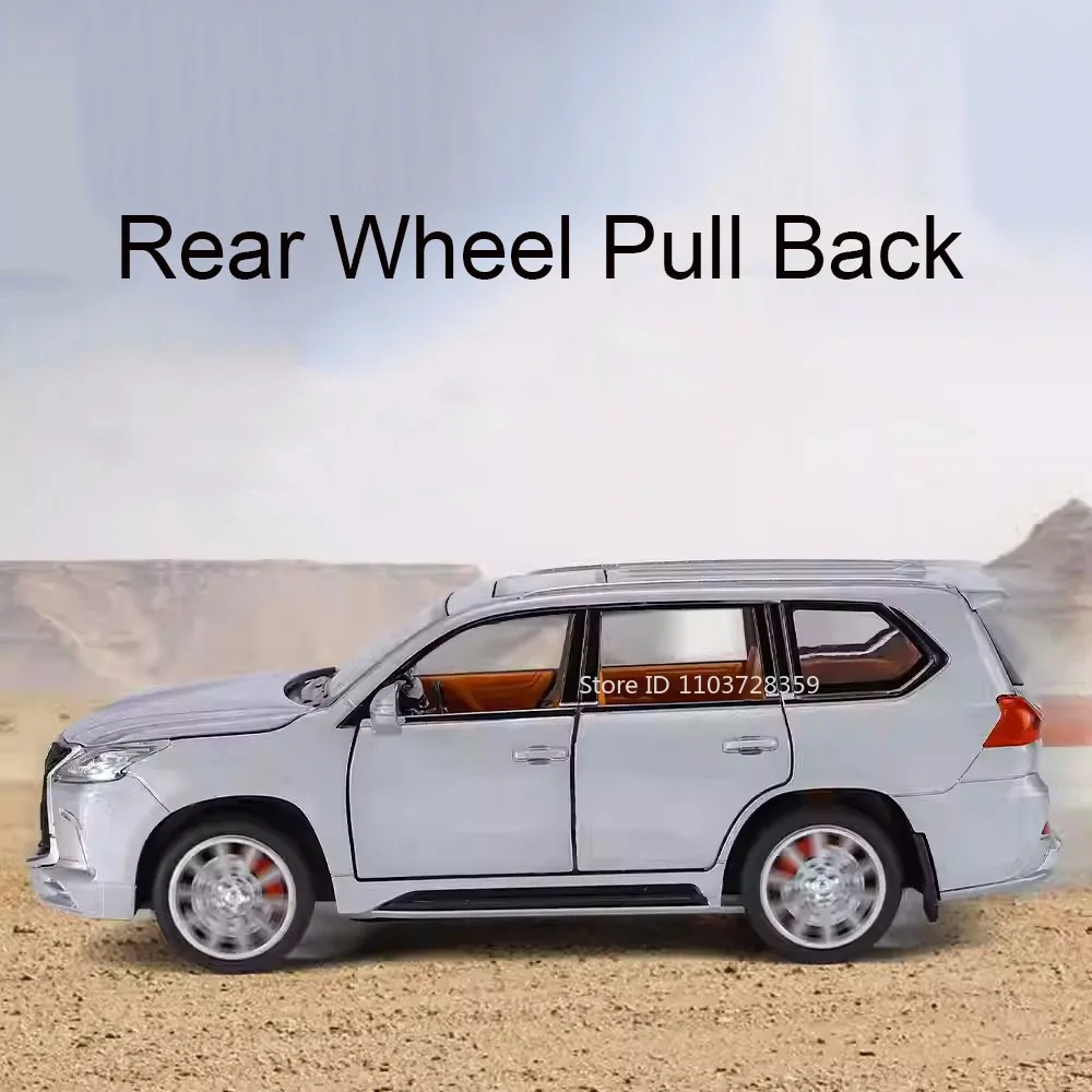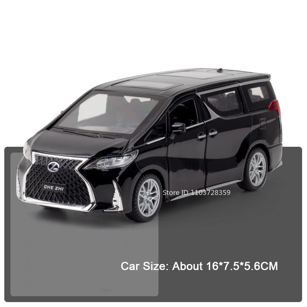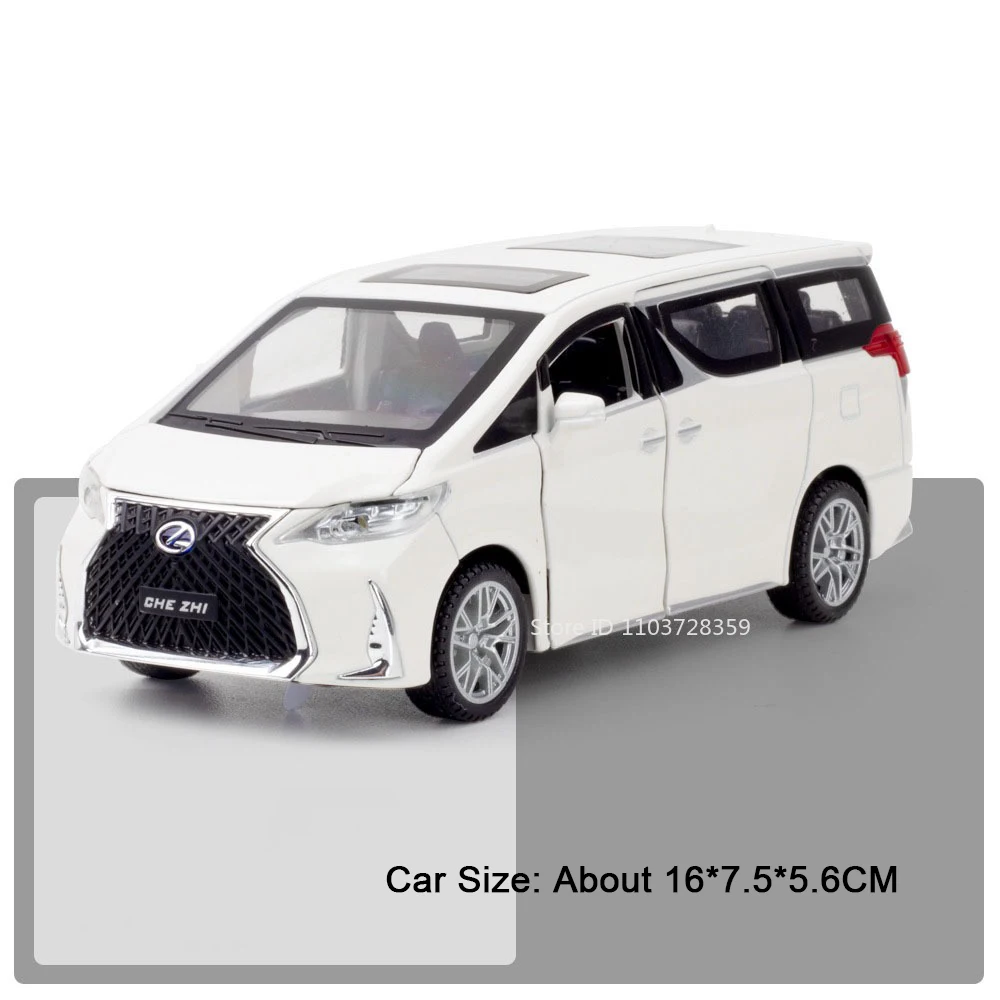 Experience the realism of this 1:32 scale miniature model car, crafted with a durable alloy metal body, plastic chassis, and rubber tires. Available in white, silver, black, and other colors, it measures approximately 15.5 x 7 x 5.5 cm (LX570) and 16 x 7.5 x 5.6 cm (LM300H). This high-fidelity model features opening doors, trunk, and hood, allowing detailed inspection of interior and engine components. equipped with sound and light effects activated by pressing the front wheels, and a pull-back mechanism for smooth forward motion. Built for collectors and enthusiasts aged 14 and above, it combines realistic design with sturdy construction for long-lasting display and play.