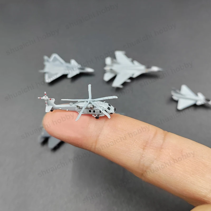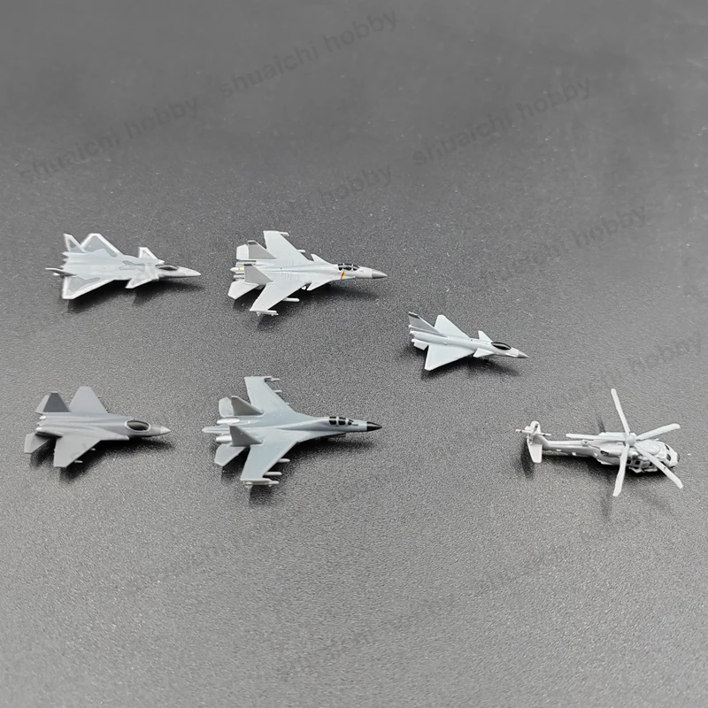 Immerse yourself in this expertly crafted set of resin miniature aircraft and helicopter models. Perfect for display or collection, these static models highlight sleek, aerodynamic designs with intricate surface details. Painted in subdued shades of gray, each model features subtle color accents, enhancing their realistic military appearance. With six distinct models—ranging from fighter jets to a helicopter—this set captures modern Chinese aircraft such as the J-35, J-20, J-16, J-15, J-10 fighter jets, and the Z-20 helicopter. Measuring approximately 3 centimeters in length at 1/700 scale, these tiny yet detailed replicas are ideal for dioramas, shelf displays, or as collectible accents for gaming enthusiasts and aviation aficionados alike. Let these models bring a realistic touch to your collection today.