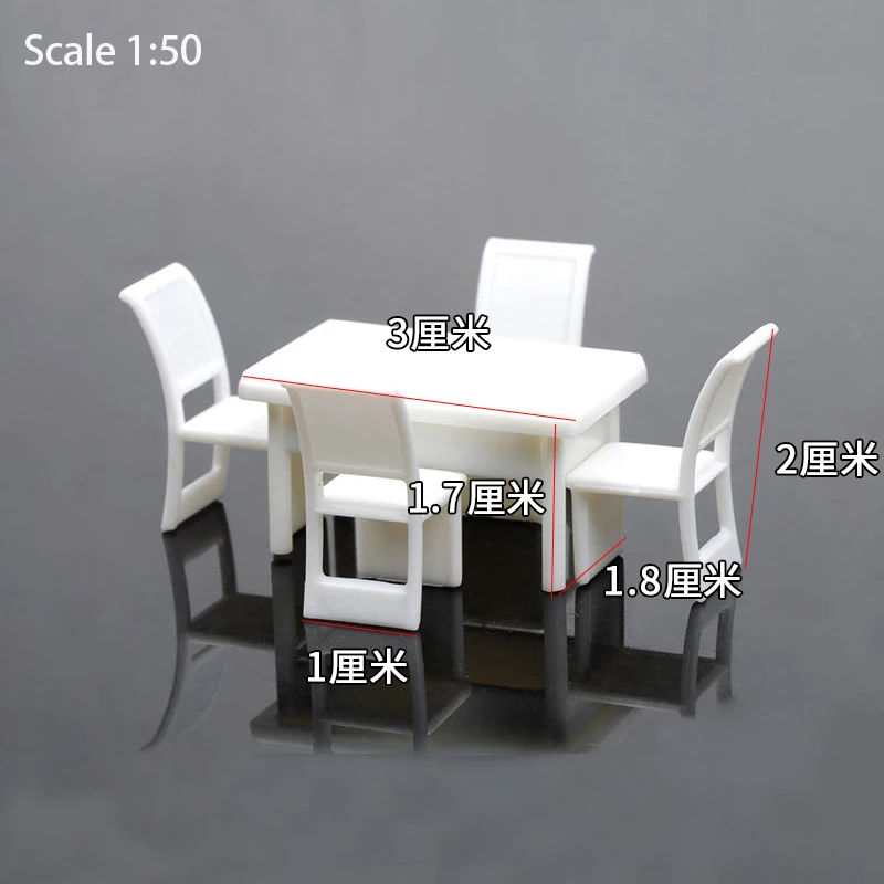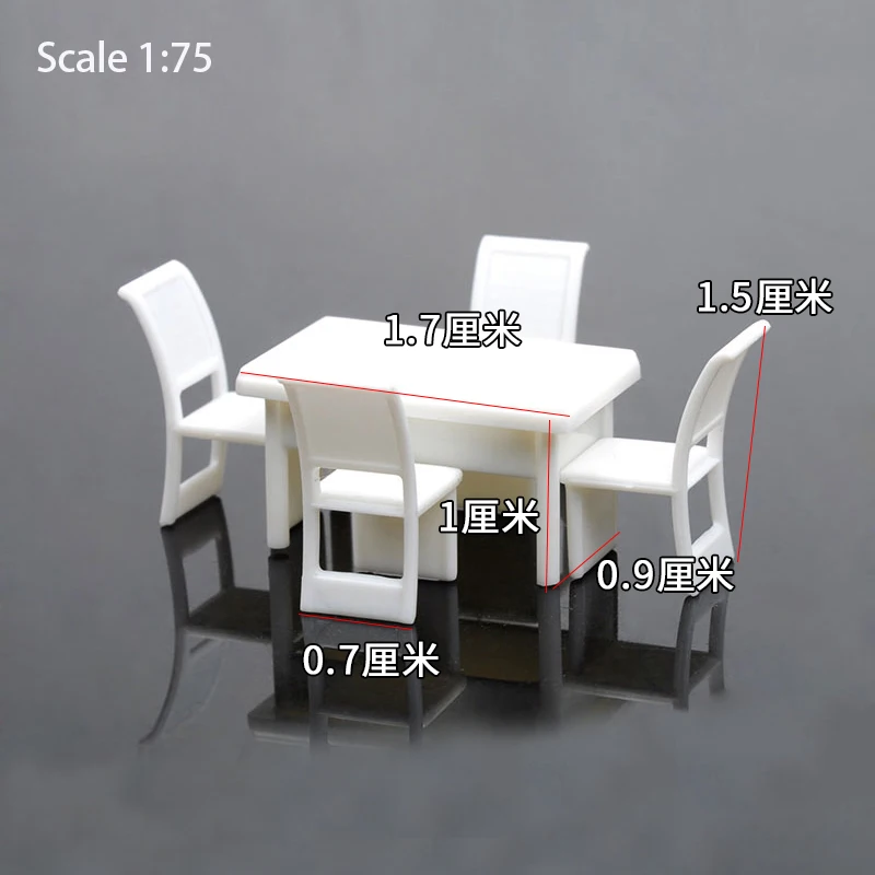 Experience the charm of this miniature table and chair set, designed to elevate your creative projects. Crafted from glossy white ABS plastic, each piece showcases a sleek, minimalist style with smooth surfaces and clean lines. Available in scales 1:50, 1:75, 1:100, and 1:150, these models are perfect for architectural displays, diorama layouts, or detailed indoor and garden scenes. The sets include four chairs and a matching table, with sizes precisely matching each scale—adding a realistic touch to your miniature environments. The simple yet refined design emphasizes contemporary aesthetics, ensuring the setup fits seamlessly into sophisticated miniature displays or projects that require elegance and precision. These high-quality miniatures are durable, lightweight, and easy to incorporate, making your scenes come alive with realism.