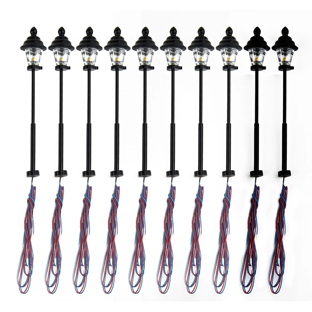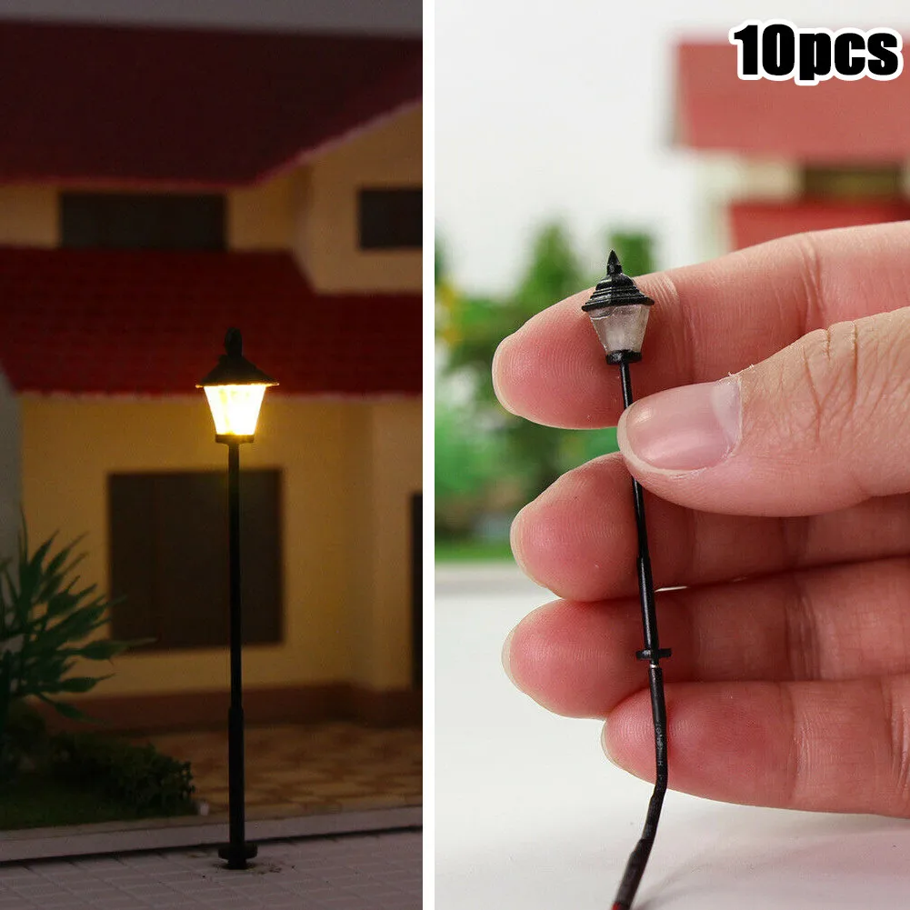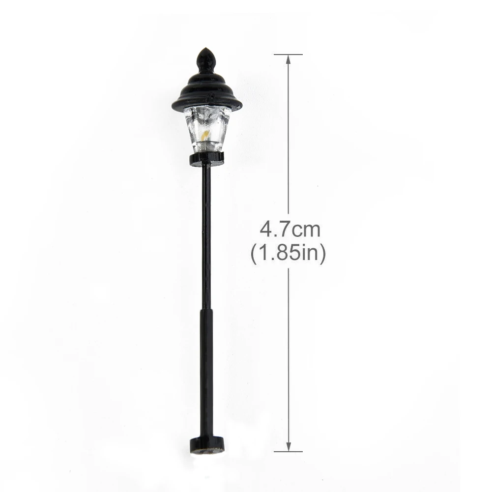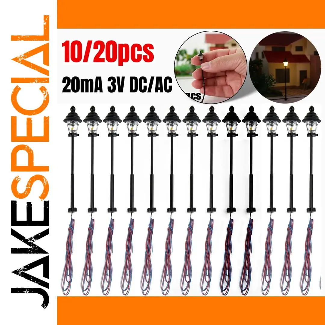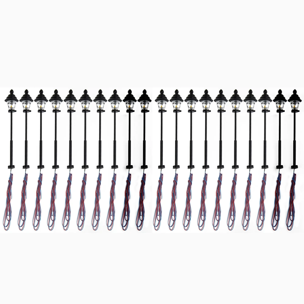 Enhance your 1/87 scale model train or architectural scene with this set of 10 or 20 miniature outdoor street lamps featuring warm white LEDs. Crafted from metal and plastic, each lamp includes a clear plastic lantern with a rounded, pointed cap, emitting a cozy glow when powered at 3V AC/DC with 20mA current. Series resistors are included for safe connection to 12-16V transformers, ensuring proper operation without damaging the LEDs. Designed specifically for low-voltage outdoor settings, these realistic miniature lamps add charm and detail to pastoral or architectural layouts, creating a captivating miniature cityscape or village scene with authentic lighting effects.