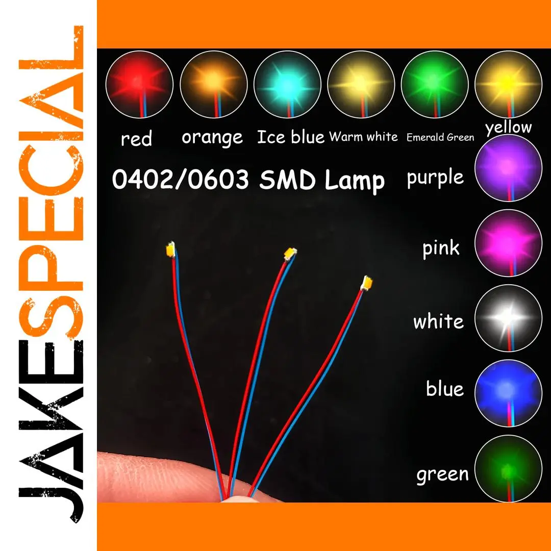 Transform your miniature projects with this versatile set of ten pre-wired SMD LED chips. Crafted in 0402 and 0603 sizes, these tiny LEDs measure approximately 1.1mm×0.55mm and 1.6mm×0.85mm respectively, ensuring discreet placement within any model or diorama. Available in 11 vibrant colors including blue, green, ice blue, orange, pink, purple, red, warm white, white, yellow, and yellow-green, they emit bright, crisp illumination. Each LED is connected to about 30cm of ultra-fine, flexible wire—red for positive and blue for negative—making installation seamless and virtually invisible once embedded. This set is ideal for model trains, cars, robots, and small-scale lighting projects, allowing you to add realistic lighting effects effortlessly and professionally.