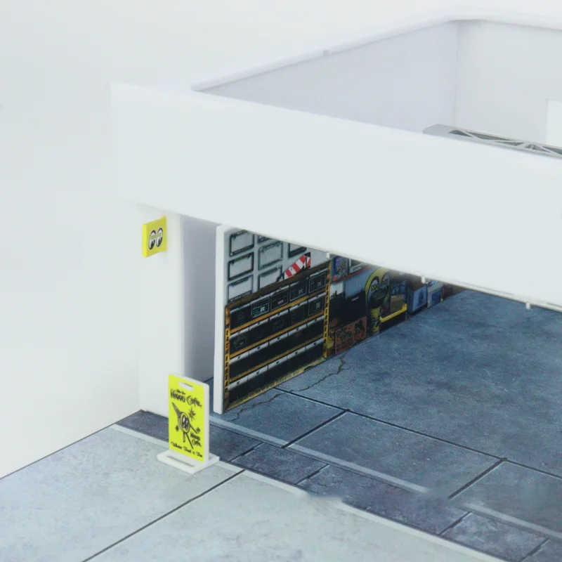Step into the world of motorsport with this meticulously crafted miniature pit garage scene. Measuring approximately 21.5 centimeters wide, 23.5 centimeters deep, and 7.3 centimeters high, this model captures the sleek, modern design of a racing garage. The structure features a bright white roof supported by elegant vertical columns, creating a crisp, contemporary look. The open front offers a detailed view of the interior, which is decorated with tiny signs and posters hinting at high-speed racing themes. The textured gray floor adds tactile realism, mimicking the rugged surfaces of actual garages. Whether displayed on a shelf or as part of a collection, this miniature fuels your passion for motorsport and automotive culture, inviting admiration and conversation.