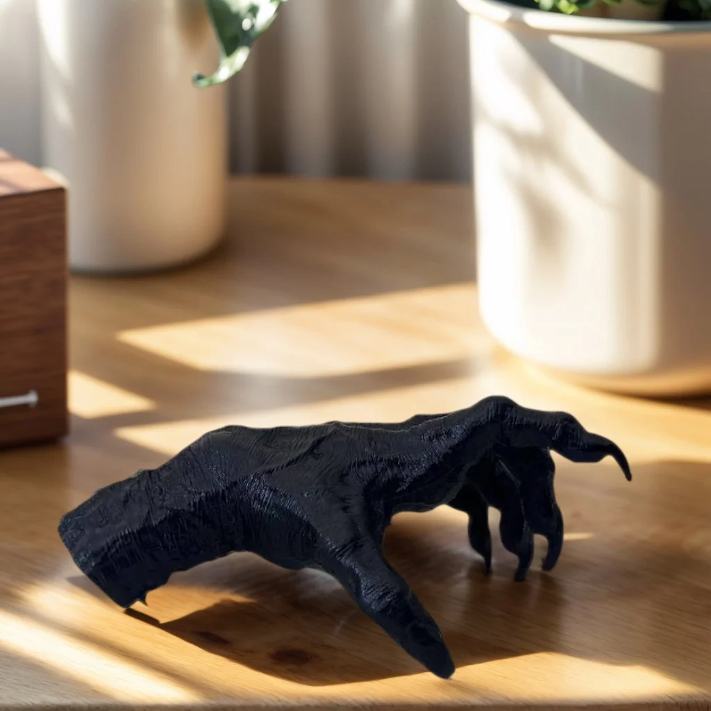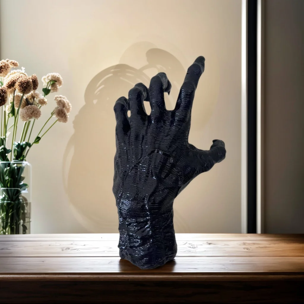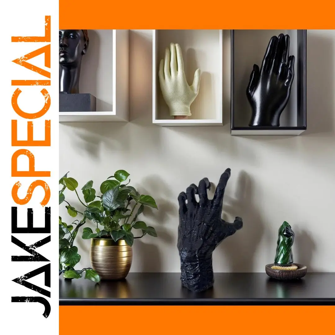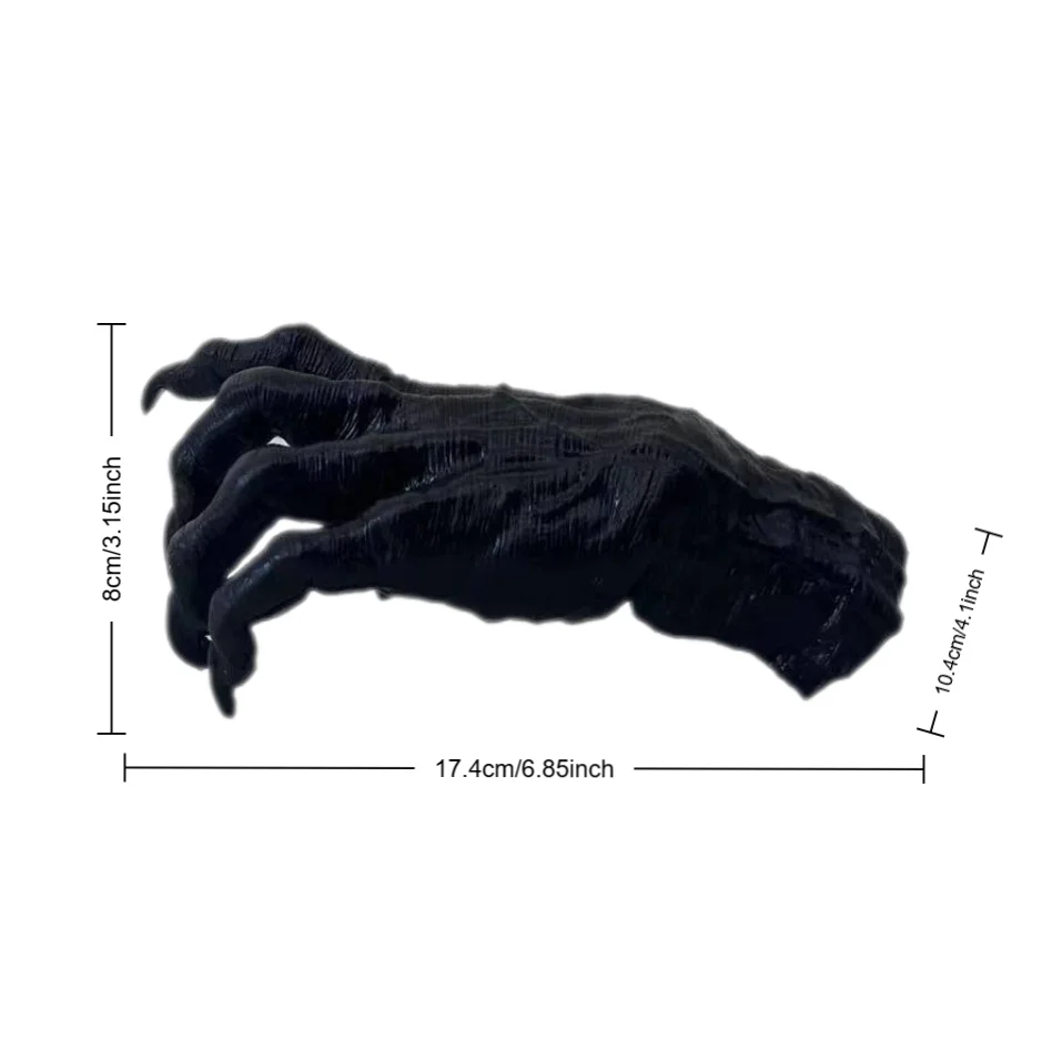 Transform your Halloween decor with this striking ghostly hand sculpture, expertly crafted from resin for a realistic and textured appearance. Its detailed knuckles and lifelike features make it an eye-catching centerpiece or spooky accent in any haunted setting. Whether hanging on a wall or sitting atop a table, this versatile prop amplifies the terrifying ambiance of haunted houses, parties, or themed events. Its miniature size ensures easy placement without cluttering your space while delivering maximum visual impact. With a sleek glossy black finish and intricate details, this hand adds a dramatic and stylish vibe to your holiday decor. Secure it as a prop or use it as a hanging hook for small items—its options are endless for creating a hauntingly memorable scene.