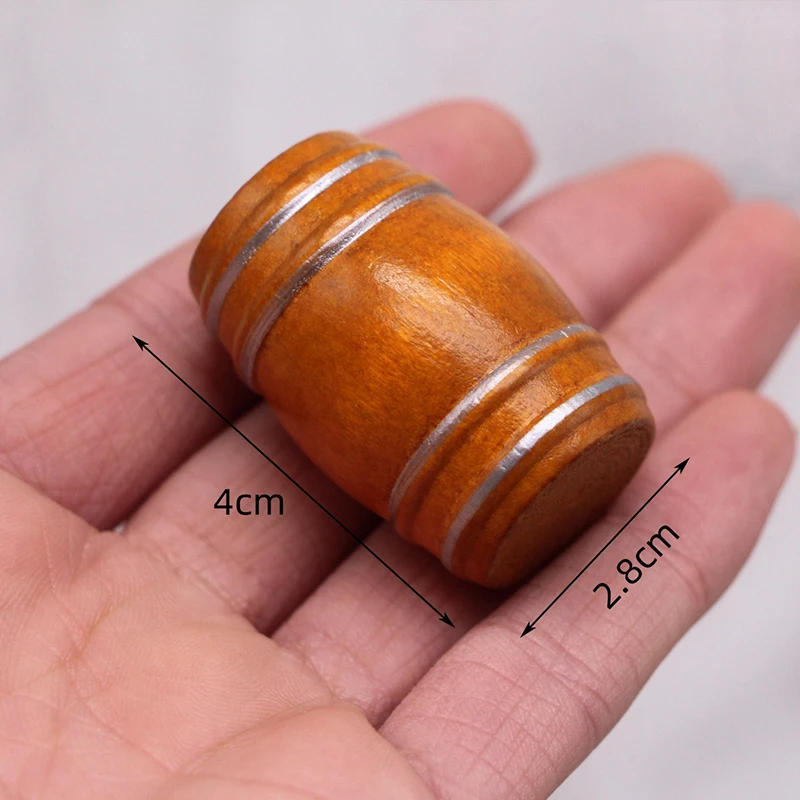 Imagine adding a touch of vintage charm to your dollhouse or diorama with this beautifully crafted miniature wooden barrel. Its warm, natural brown hue and rustic design evoke an old-fashioned style perfect for enhancing fantasy, sci-fi, or vintage scenes. Measuring approximately 4 centimeters in length and 2.8 centimeters in width, it features a smooth, polished surface with subtle wood grain details that showcase quality craftsmanship. Silver-colored metal bands encircle the top and bottom edges, adding an authentic, vintage look. Whether used as a scenic element or a collectible accent, this miniature barrel effortlessly brings personality and charm to your display. Its durable design ensures it remains in perfect condition over time, enriching your miniature world with rustic elegance.