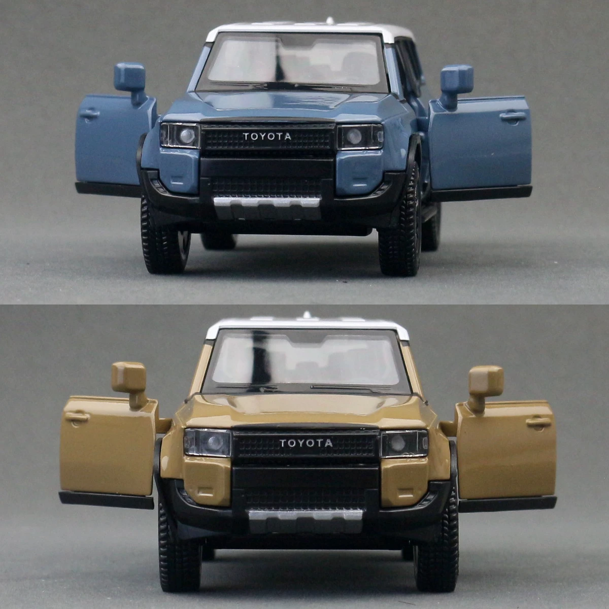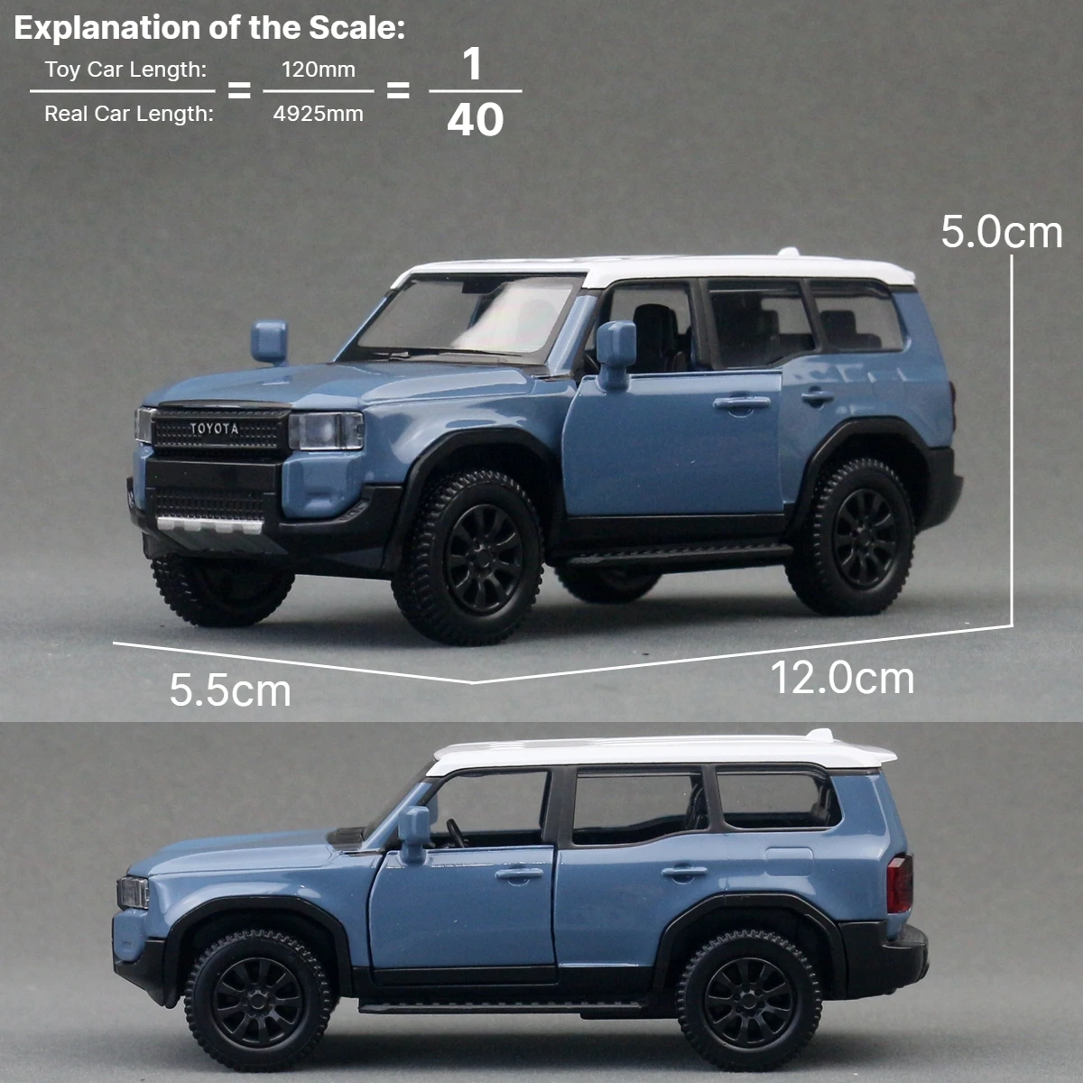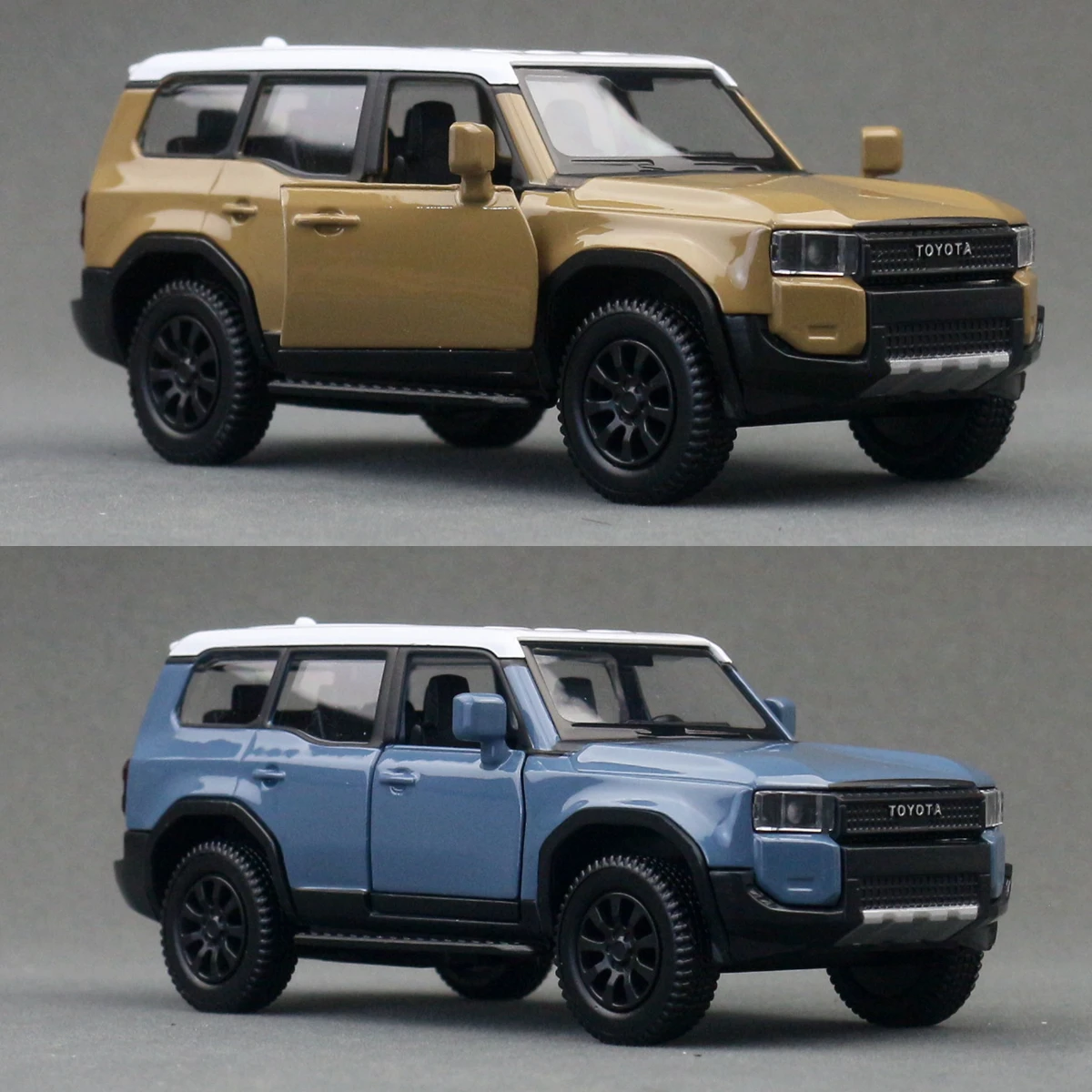Experience the rugged charm of this detailed miniature Toyota Land Cruiser LC250 diecast model. Crafted with precision at a 1:40 scale, this premium collectible showcases a realistic off-road SUV design that appeals to enthusiasts. The vibrant blue finish features a glossy, smooth surface, while the contrasting white roof adds a unique two-tone effect. Its boxy shape, pronounced wheel arches, and detailed exterior elements evoke durability and adventure. The black grille with bold white “TOYOTA” lettering, textured rugged wheels, and dark tinted side windows enhance its authentic appearance. Suitable for collection, display, or as a thoughtful gift, this model seamlessly combines realism with quality craftsmanship for a truly captivating display piece.