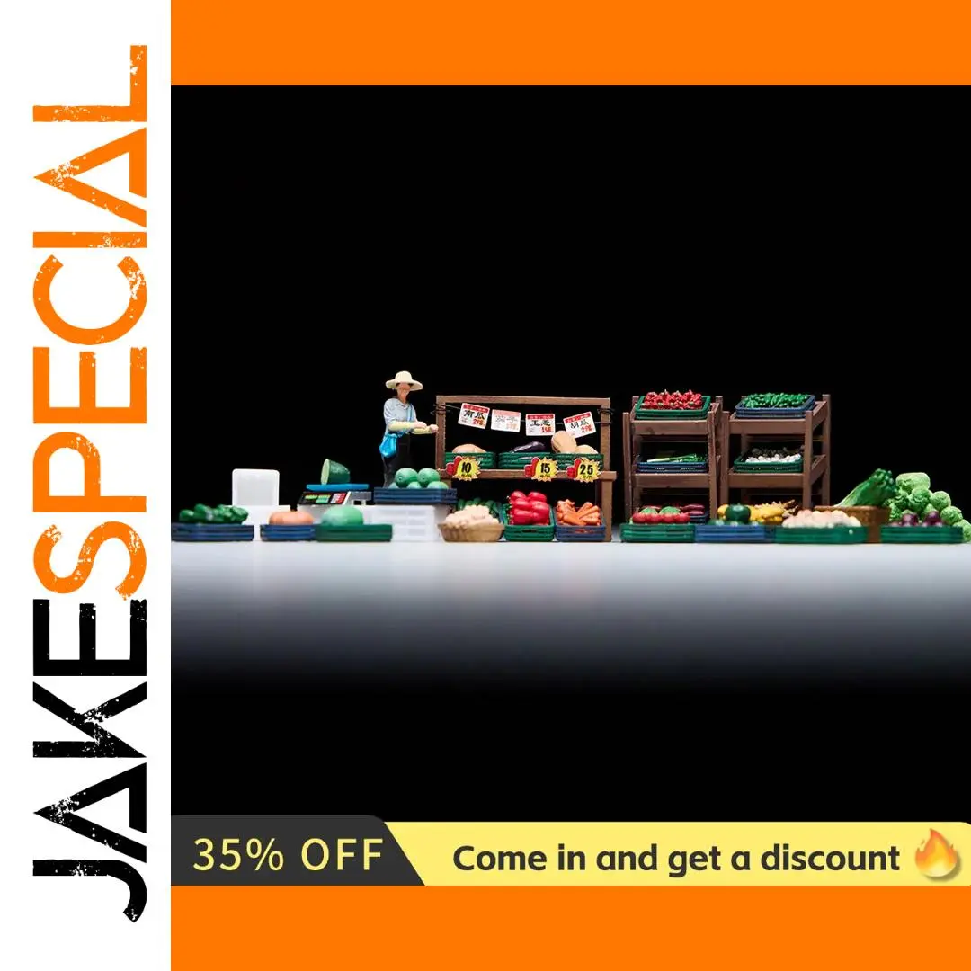 Imagine bringing a bustling market atmosphere right to your diorama or miniature collection with this incredibly detailed, resin-crafted scene. You’ll notice the vibrant colors of miniature vegetables like leafy greens and bright orange produce, meticulously arranged on ground platforms, shelves, and baskets. A vendor figure, dressed in traditional market attire with a wide-brimmed straw hat, holds a vegetable, adding realism and life to the scene. The natural wood textures of the shelving units contrast beautifully with the vivid produce, creating an eye-catching display full of charm. Perfect for model enthusiasts, this miniature captures the lively essence of a local vegetable stand, crafted with precision to add authenticity and visual appeal to your collection or display setup.