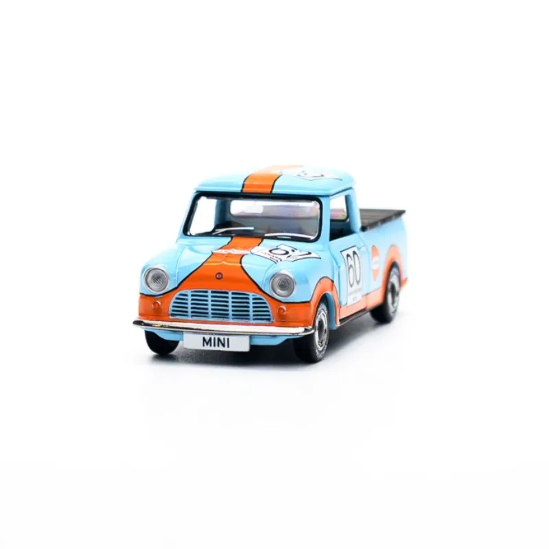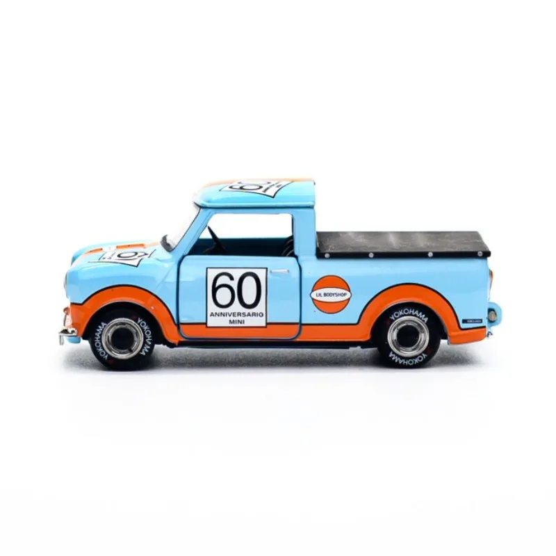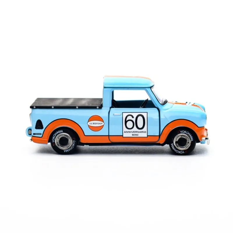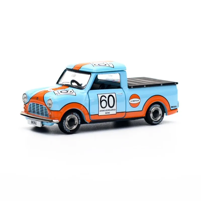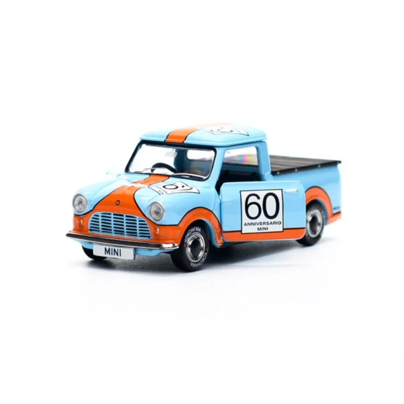 Experience nostalgic craftsmanship with this TAKARA TOMY 1:50 scale diecast metal miniature pickup truck, featuring a vibrant light blue body with bold orange accents and classic vintage design elements. The detailed model includes a silver-trimmed large grille, round headlights, black bed with realistic molding, and clean paint lines for an authentic look. With precise proportions and a polished finish, this collectible showcases a retro aesthetic perfect for display or gifting. Crafted from durable metal, it offers a nostalgic charm that appeals to adult collectors and enthusiasts, adding a touch of vintage style to any collection.