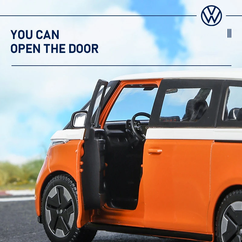 Experience the charm of this detailed miniature Volkswagen ID Buzz 2023, meticulously crafted in 1:24 scale. Featuring vibrant orange and yellow options, this diecast model captures the modern, boxy van's sleek lines and spacious design. With realistic black and white accents, transparent windows revealing a subtly detailed interior, and alloy wheels with textured tires, it offers a visually authentic representation of the real vehicle. Made from alloy and plastic, it exudes quality and durability, perfect for collectors or enthusiasts. Whether displayed on a shelf or used as a thoughtful gift, this model brings a touch of contemporary automotive style to your collection, allowing you to enjoy and showcase its impressive realism every day.