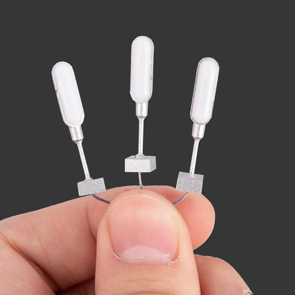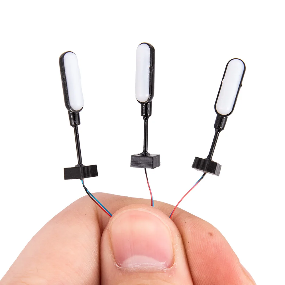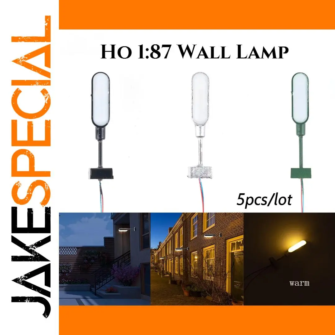 Enhance your 1:87 scale railway or building scene with this set of five miniature wall lamps, each measuring 28mm tall and crafted from durable plastic. Featuring sleek, cylindrical designs, these lamps emit a warm white glow powered by 3V LEDs drawing only 20mA. Available in stylish black, green, and silver finishes, they add an authentic, cozy ambiance to your dioramas, model train layouts, or miniature scenes. Their minimalist, modern aesthetic ensures seamless integration into detailed environments, providing realistic lighting effects for dusk or nighttime settings. Perfect for adult hobbyists seeking high-quality, visually appealing lighting to bring their models to life.