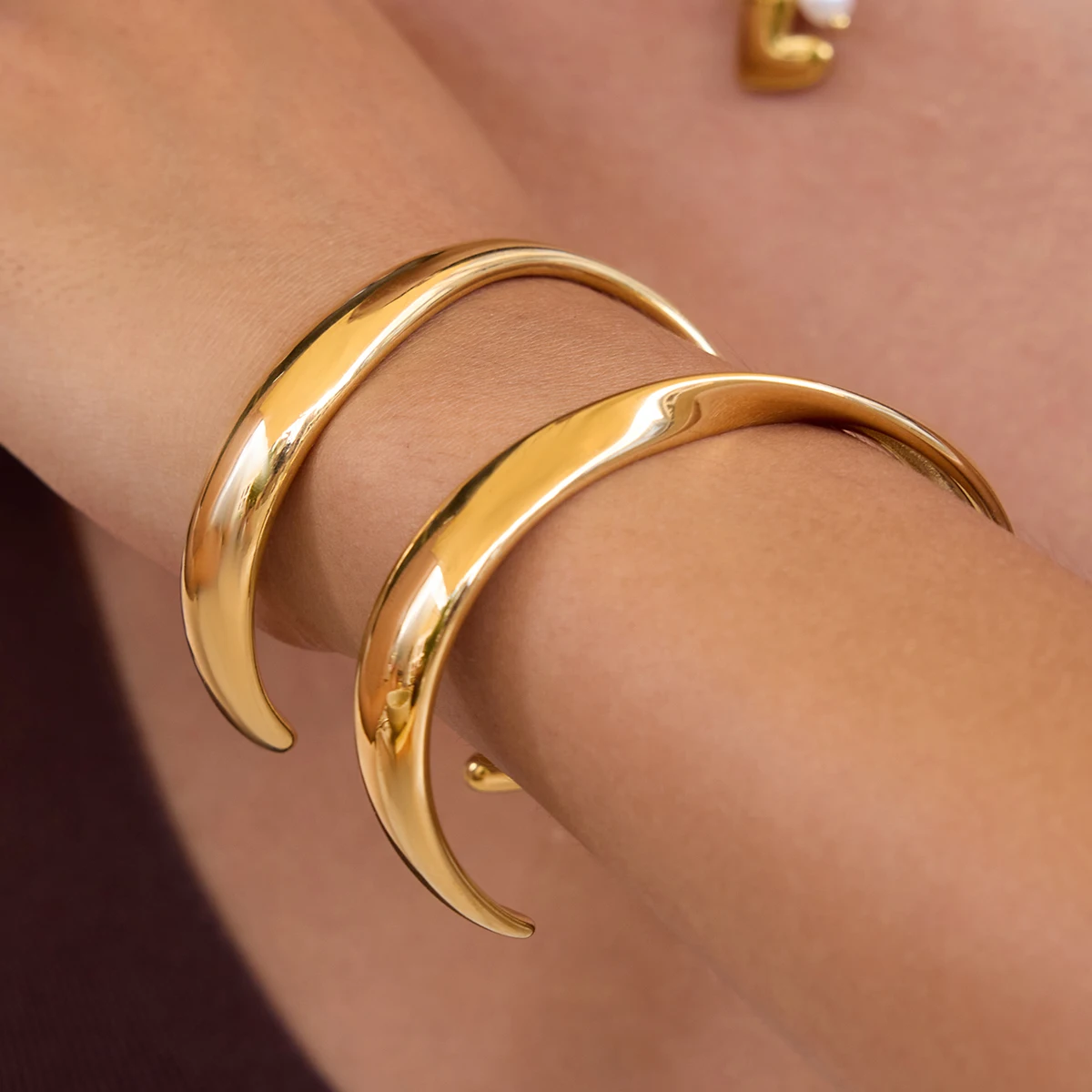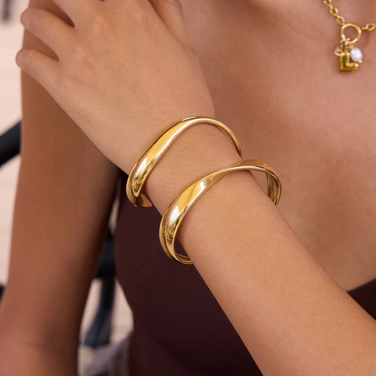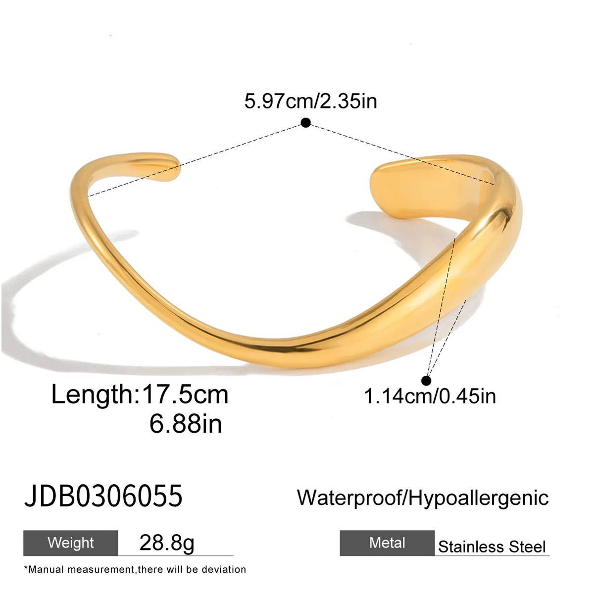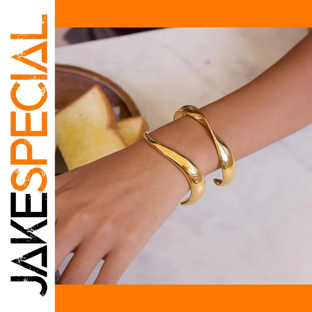 Experience elegance and modern style with this minimalist gold-colored stainless steel cuff bracelet. Its asymmetrical, flowing line gracefully curves around your wrist, creating a sleek and sophisticated look. Crafted from high-quality stainless steel, it features a polished, high-gloss finish in a luxurious gold hue with platinum accents, giving it a shiny, reflective surface that enhances its contemporary appeal. The round, open-ended design tapers slightly at each end, ensuring comfort and a perfect fit. With its unembellished surface, this bracelet exudes a clean, trendy aesthetic suitable for everyday wear or special occasions. Waterproof and durable, it offers long-lasting beauty and versatility, making it an essential statement piece that elevates any outfit with ease.