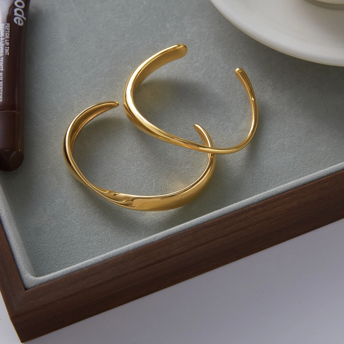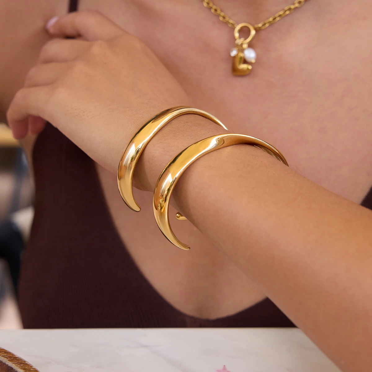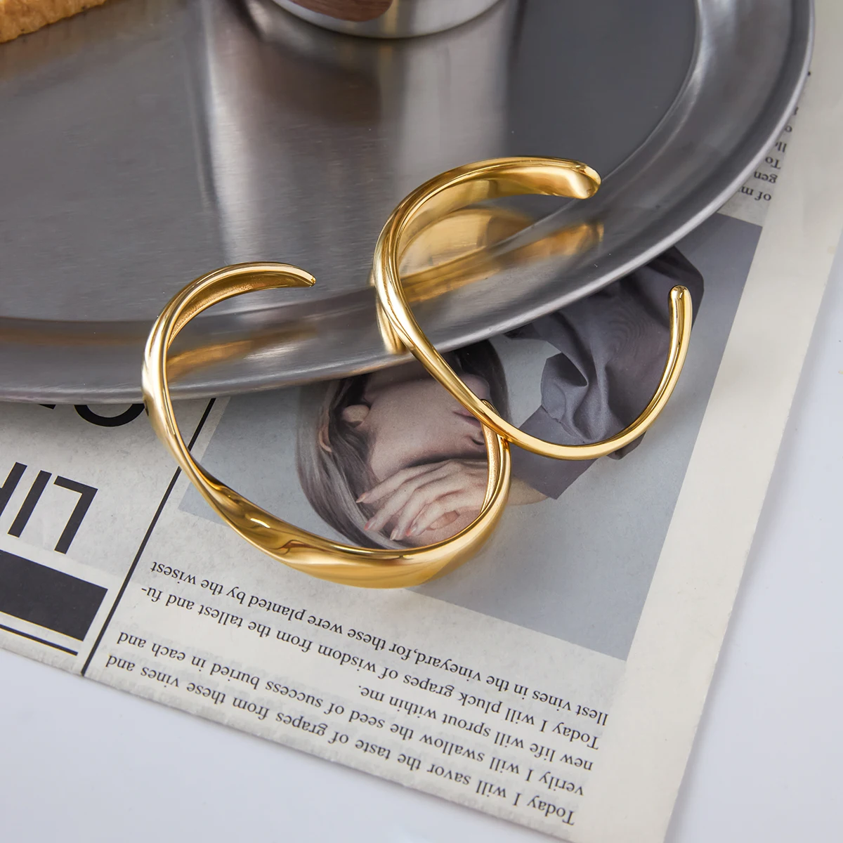 Experience elegance and modern style with this minimalist gold-colored stainless steel cuff bracelet. Its asymmetrical, flowing line gracefully curves around your wrist, creating a sleek and sophisticated look. Crafted from high-quality stainless steel, it features a polished, high-gloss finish in a luxurious gold hue with platinum accents, giving it a shiny, reflective surface that enhances its contemporary appeal. The round, open-ended design tapers slightly at each end, ensuring comfort and a perfect fit. With its unembellished surface, this bracelet exudes a clean, trendy aesthetic suitable for everyday wear or special occasions. Waterproof and durable, it offers long-lasting beauty and versatility, making it an essential statement piece that elevates any outfit with ease.