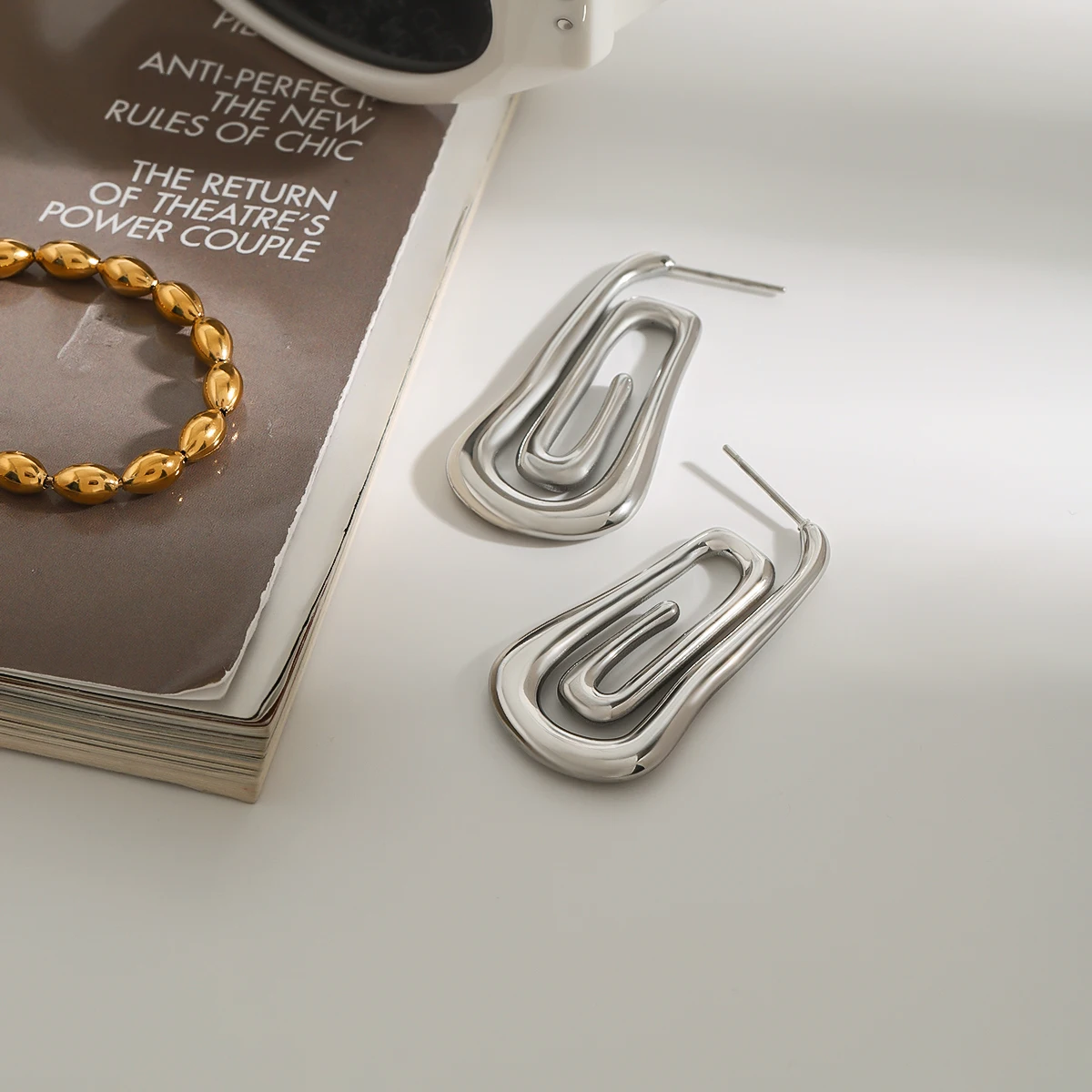 - Modern spiral paperclip design with abstract, elongated contours for a stylish, contemporary look suitable for everyday wear.
