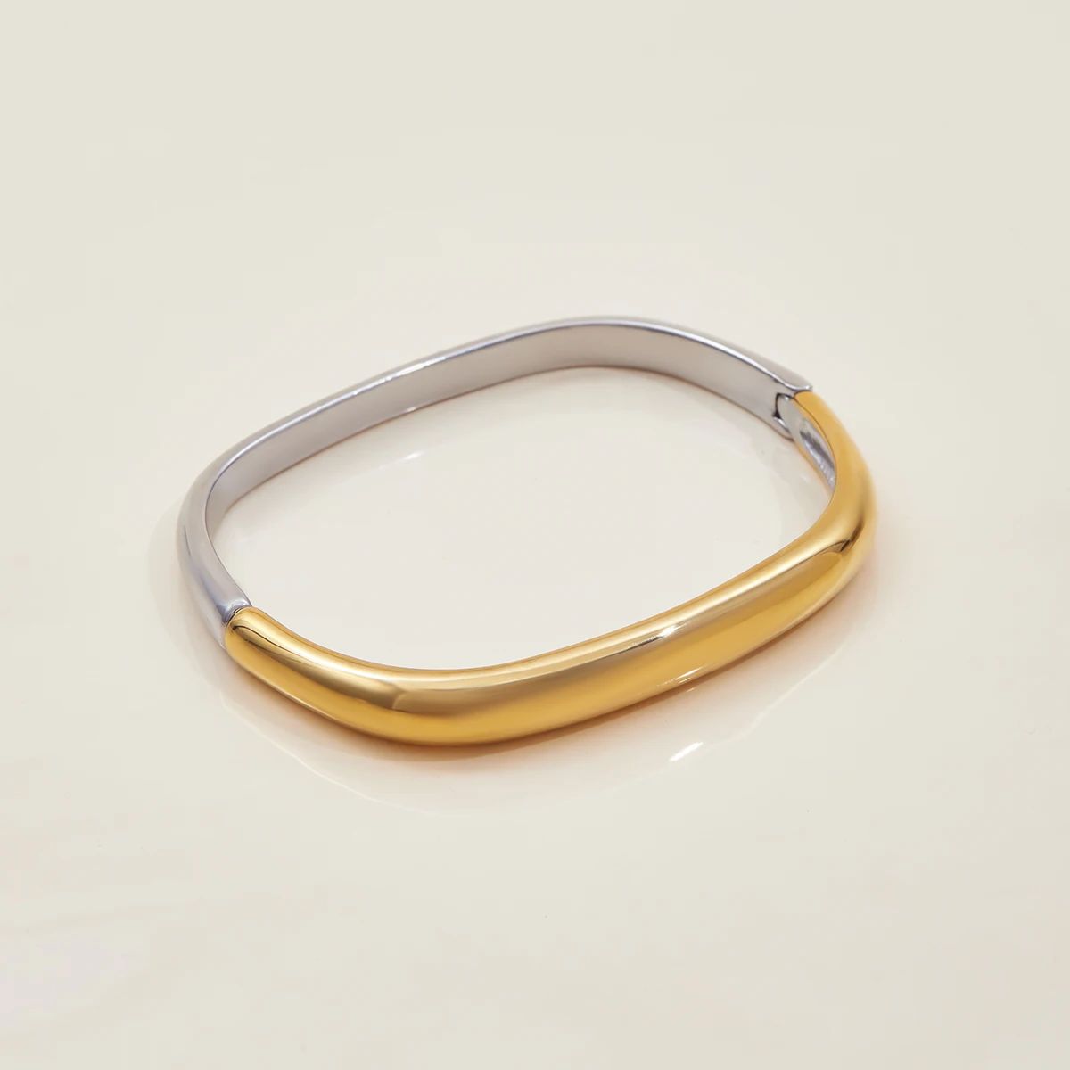 Elevate your everyday style with this elegant set of three minimalist bangles, expertly crafted from high-quality stainless steel. The collection features two warm, gold-colored bangles and one cool silver-colored piece, creating a striking contrast that complements any outfit. Each bangle showcases a sleek, geometric square motif, emphasizing modernity and simplicity. Its highly polished, reflective surface adds a sophisticated shine that captures light beautifully. The slightly rounded, open oval shape offers a comfortable fit, suitable for stacking or standalone wear. Incorporating a subtle colorblocked clasp that blends seamlessly into the design, these bangles offer both elegance and practicality. With the added functionality of a mood tracker, this set is perfect for those who value style and personal well-being.