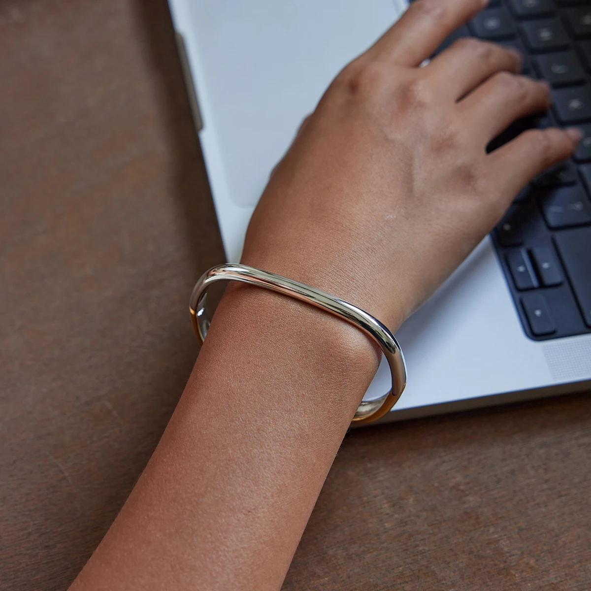 - Slightly rounded, open oval shape with a seamless, colorblocked clasp integrated into the design, maintaining clean lines and understated elegance for seamless stacking or solo wear.