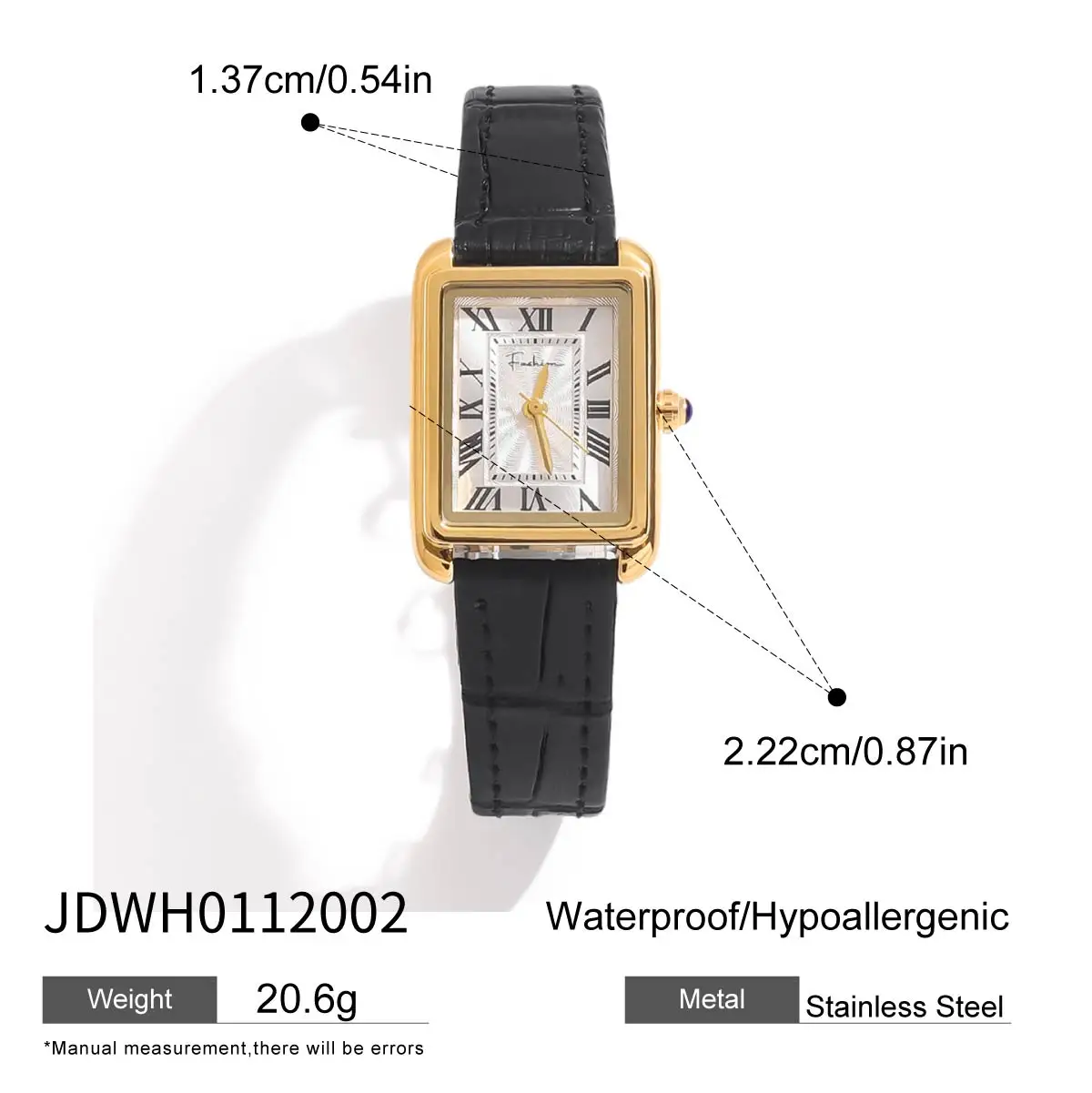 Experience timeless elegance with the Model JDWH0112001 minimalist women’s watch featuring a durable stainless steel square case with a 12mm diameter and 0.96mm thickness. The sleek black leather strap, 12cm long and 2mm wide, secures with a bracelet clasp, complementing the silver-tone PVD stainless steel construction. The dial’s 12mm diameter showcases luminous hands and a glass window, equipped with advanced quartz movement and multiple functions including chronograph, auto date, backlight, shock resistance, moon phase, multiple time zones, perpetual calendar, and water resistance up to 3 bar. Weighing just 40 grams, this waterproof, nickel-free watch embodies sophisticated, versatile style for everyday luxury.