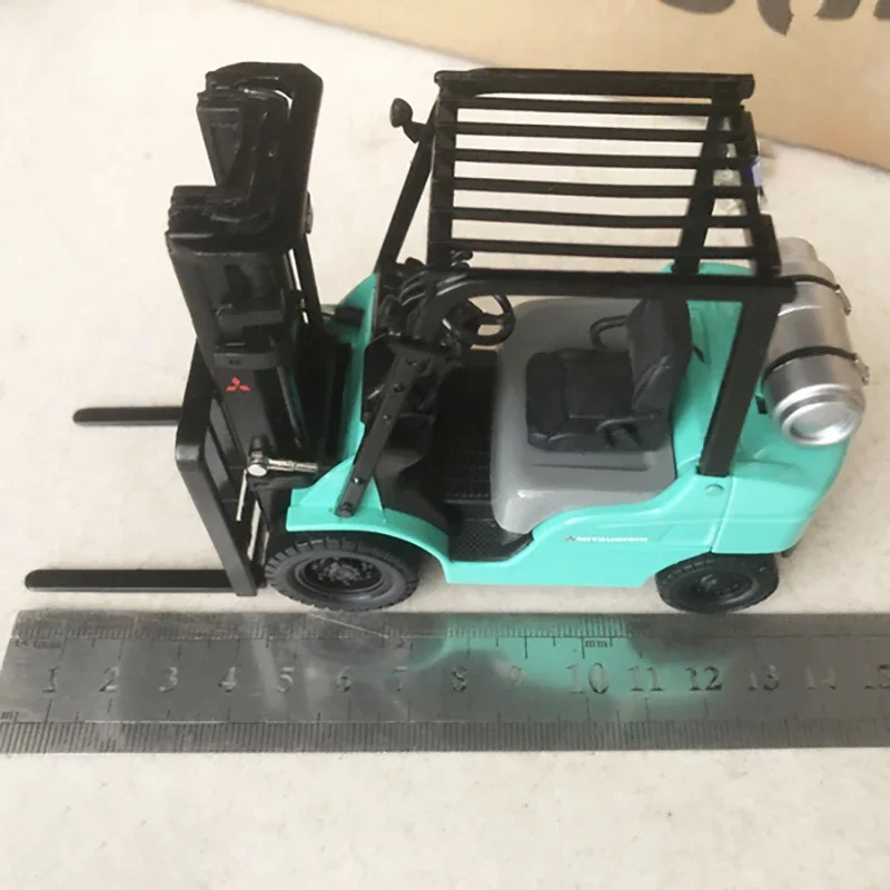 This 1:25 scale diecast alloy model of the Mitsubishi FG25N forklift measures 18.5 cm in length, 8 cm in width, and 11.5 cm in height, showcasing detailed craftsmanship with a sleek modern design. Constructed from durable alloy and hard plastic, it features a vibrant cyan blue body contrasted by black components, including the cabin interior, mast, forks, and wheels. Silver accents add realism, while the compact, realistic structure emphasizes functionality and high-quality aesthetics. Perfect for collectors and enthusiasts, this non-electric, battery-free model is suitable for ages 14 and above, providing an impressive display piece or addition to any machinery collection.