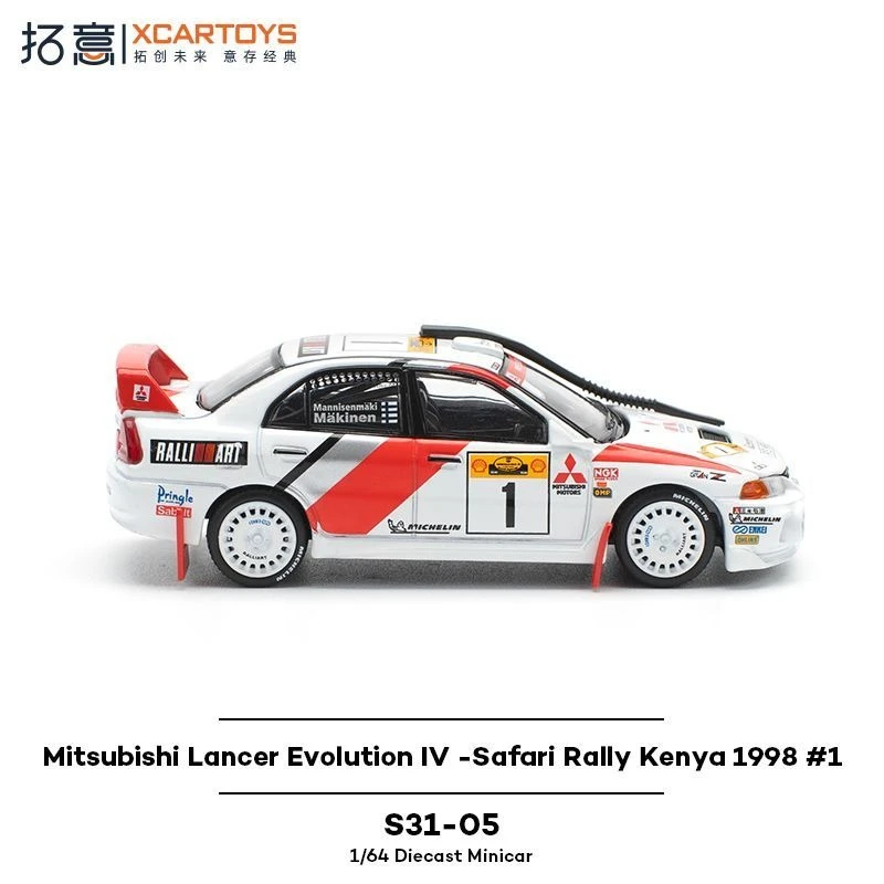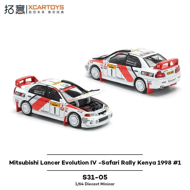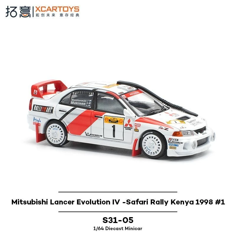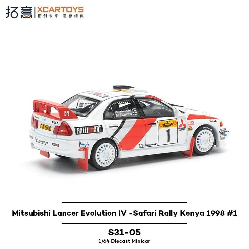 Experience the thrill of rally racing with this highly detailed Mitsubishi Lancer Evolution IV model. Crafted with precision, this scaled 1:64 diecast alloy car captures the authentic look of the legendary vehicle used in 1998 Safari Rally Kenya. It features a striking white body accented by a bold red diagonal stripe, running from the front wheel arch to the rear, creating a sense of speed and energy. The model showcases realistic black and silver details, such as side mirrors, window trims, and grille, while the flared wheel arches house white multi-spoke rally tires with detailed treads. Finished with crisp decals—including sponsor logos like Michelin and NGK—and a large red spoiler, this static collectible radiates high-performance rally car aesthetics. It’s ideal for display or as a cherished gift for enthusiasts.
