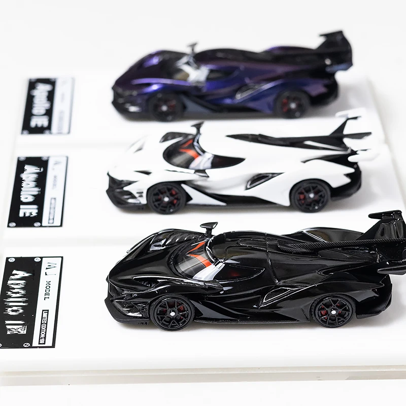 Experience the thrill of owning the exquisite MJ MODEL 1:64 Apollo IE Resin Model Car collection, featuring a stunning trio of diecast models in purple, white, and black. Each car showcases a sleek design with aggressive lines and intricate detailing. The glossy finish of the purple model catches the light beautifully, complemented by striking black accents. The glossy white model presents a bright, eye-catching appearance, while the matte black version adds a bold contrast with its sleek aesthetics. Positioned on clear display bases, these models are perfect additions for collectors and enthusiasts who appreciate automotive art.