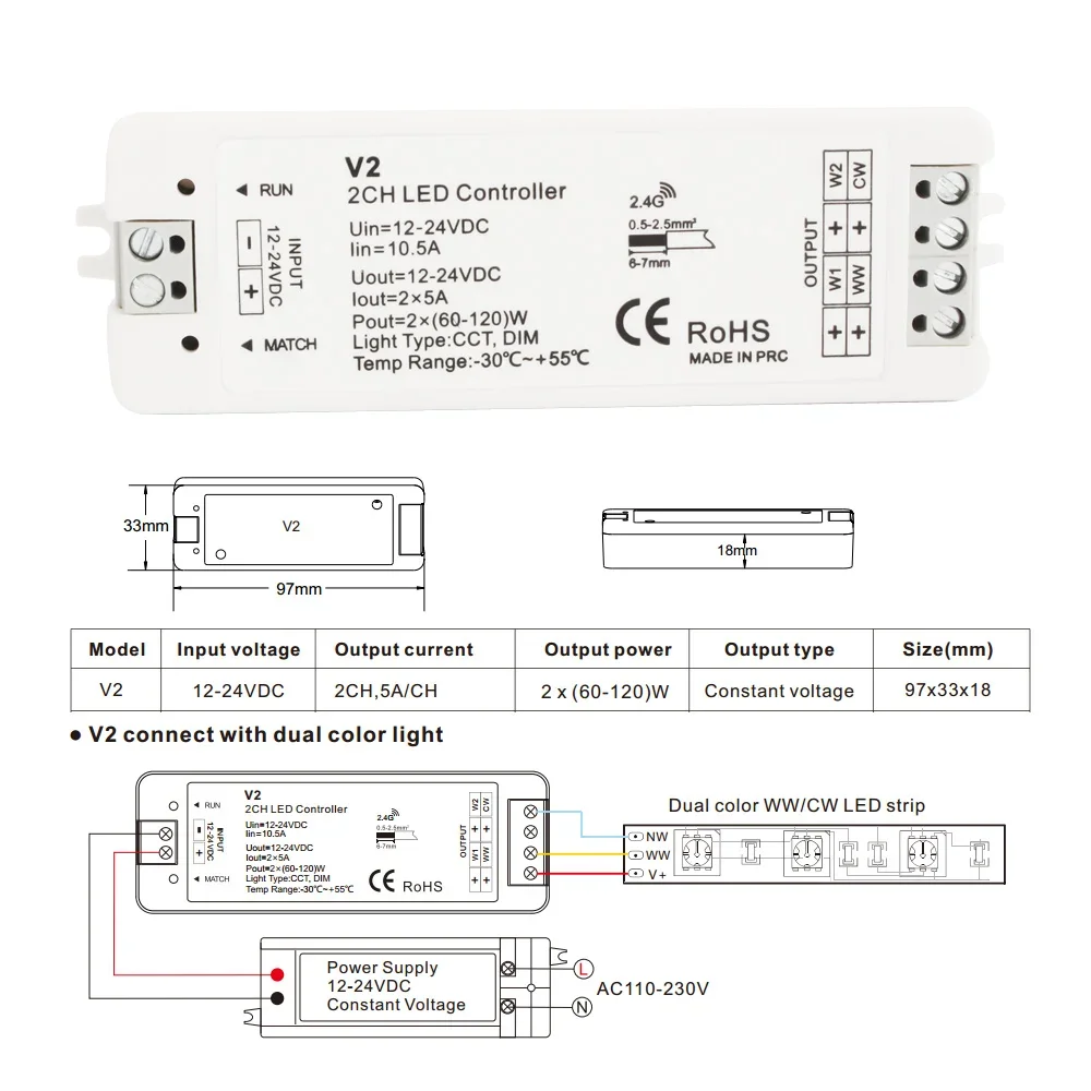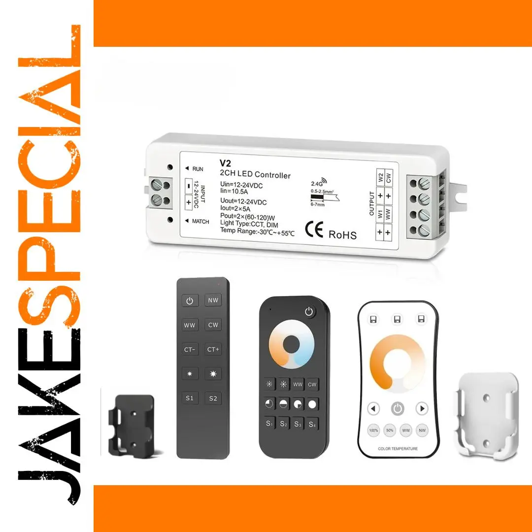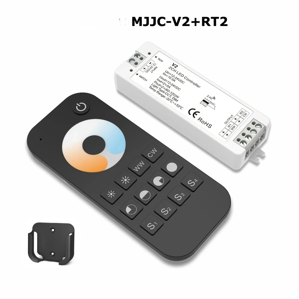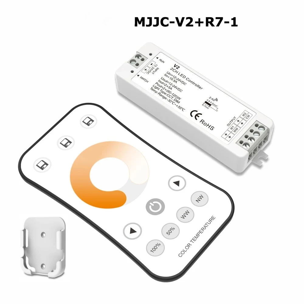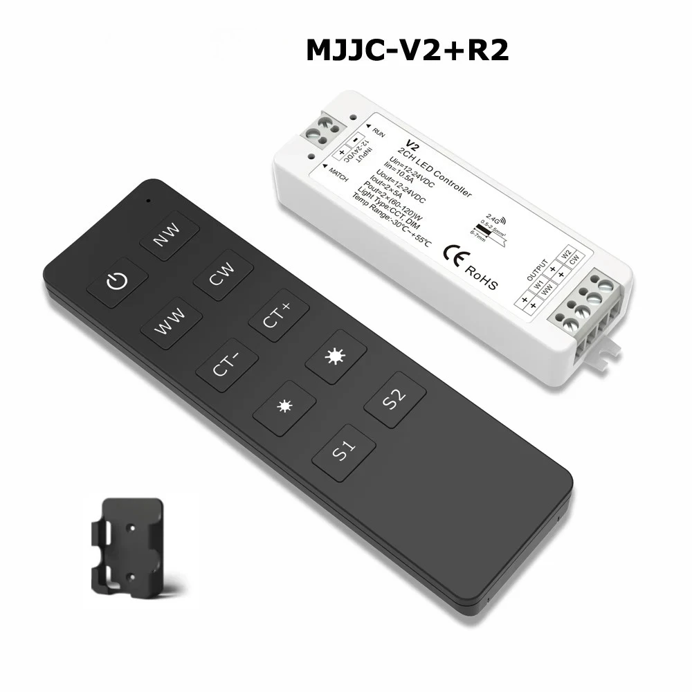 Experience seamless control of your dual-color (WW/CW) LED strip lighting with this sleek MJJC-V2 LED controller. Designed for 12-24V DC systems, it features two channels with a maximum output of 10A (5A per channel), supporting PWM constant voltage or current output. Its compact size of 97x33x18mm pairs with a robust 2.4GHz wireless remote that operates up to 30 meters, allowing easy, multi-zone lighting management. Compatible with single or multiple zones, the system supports up to ten remotes and expansion via power repeaters for unlimited output. The included remotes, with various styles and functions, ensure intuitive brightness and color temperature adjustments, making your lighting setup smart, efficient, and versatile.